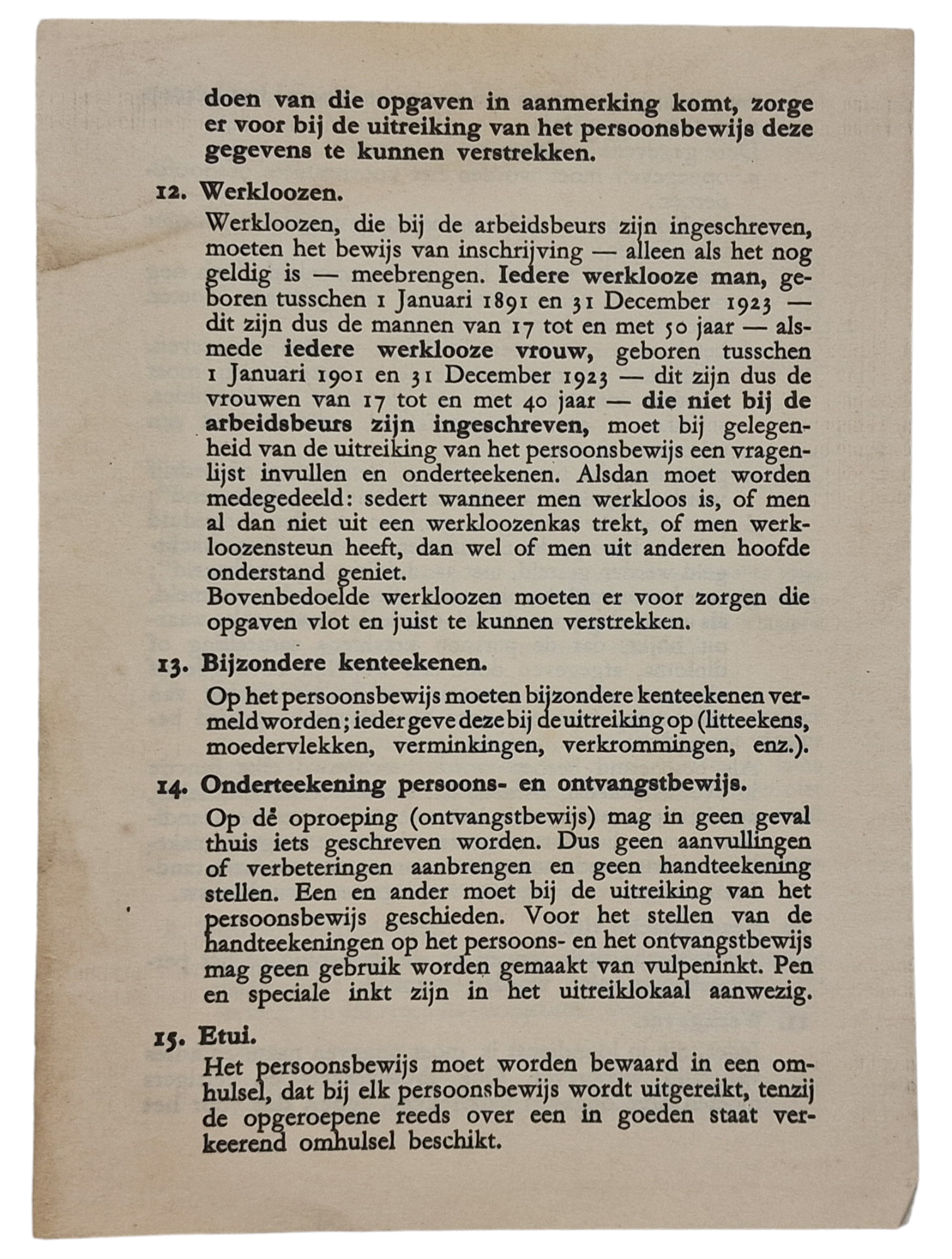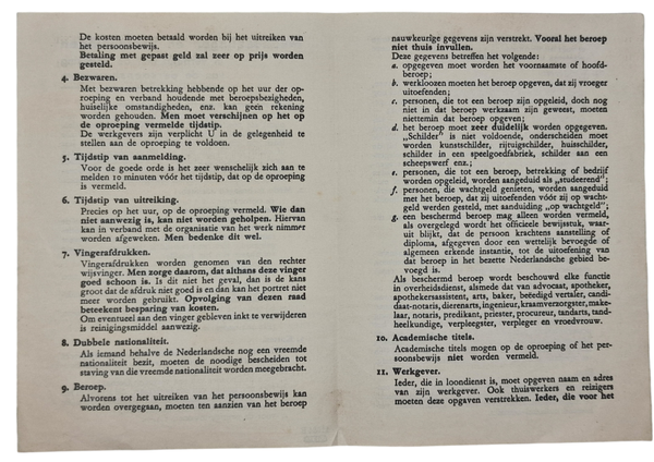 Original WW2 Dutch Document - Persoonsbewijs instructions