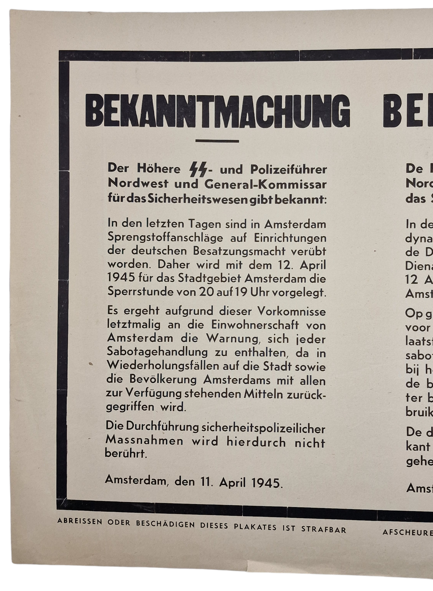 Originele Wo2 Duitse Poster - SS Bekendmaking poster avondklok, Amsterdam, 14 April (1945)