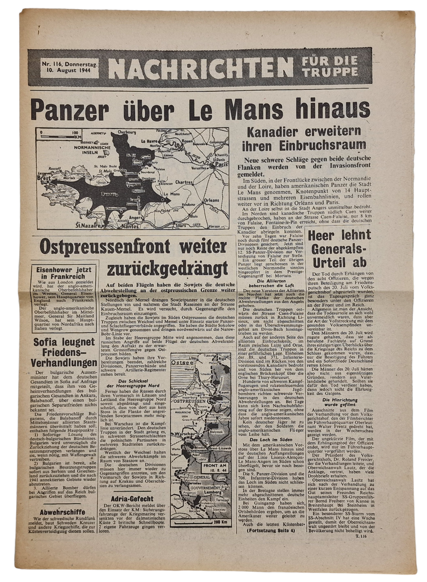 Original WW2 British Leaflet - Nachrichten für die Truppe Nr. 116, Le Mans, Operation Overlord (1944)