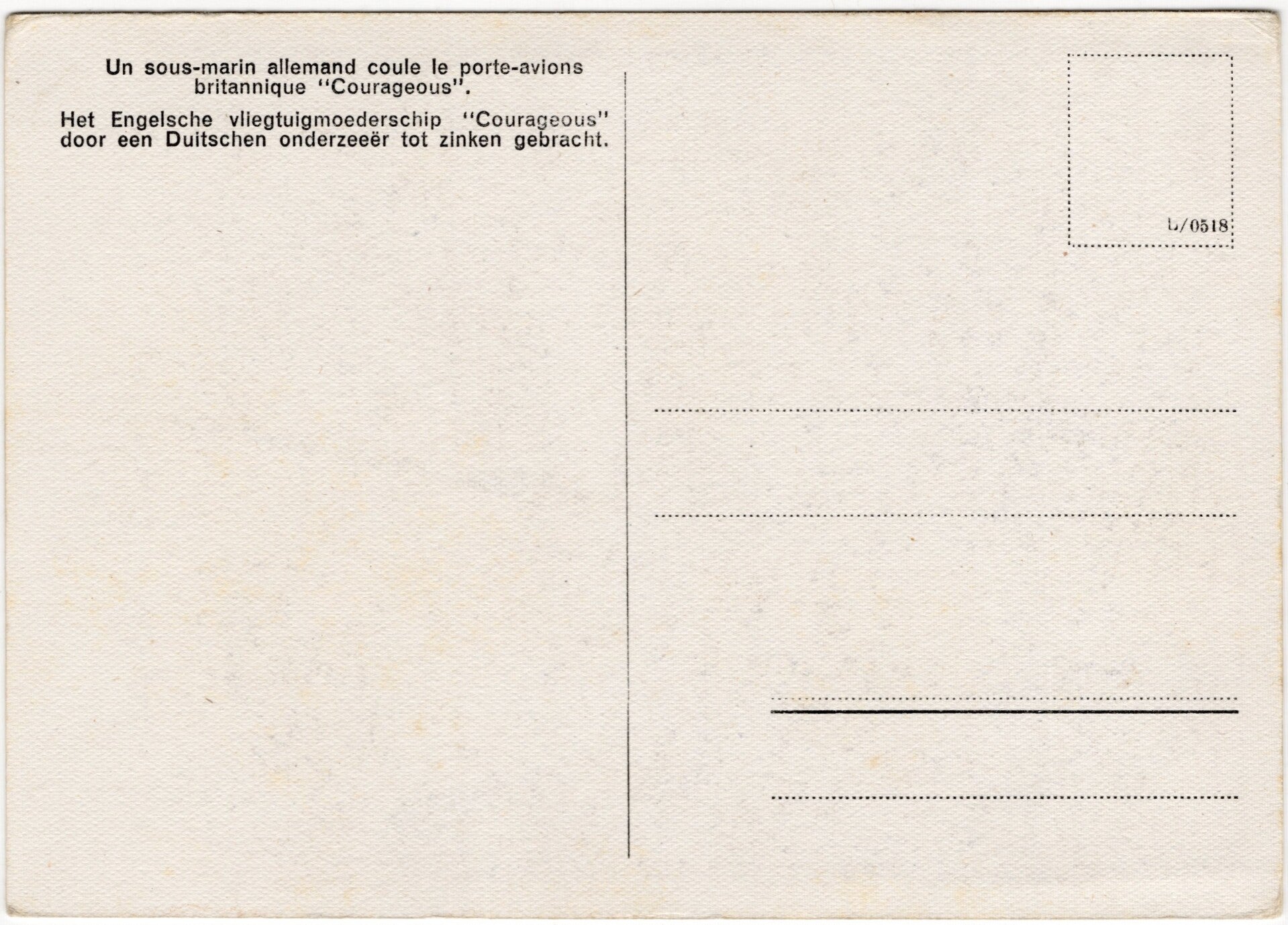 Original WW2 Belgian Collaboration Postcard - ''Het Engelsche vliegtuigmoederschip Courageous door een Duitschen onderzeeër tot zinken gebracht''