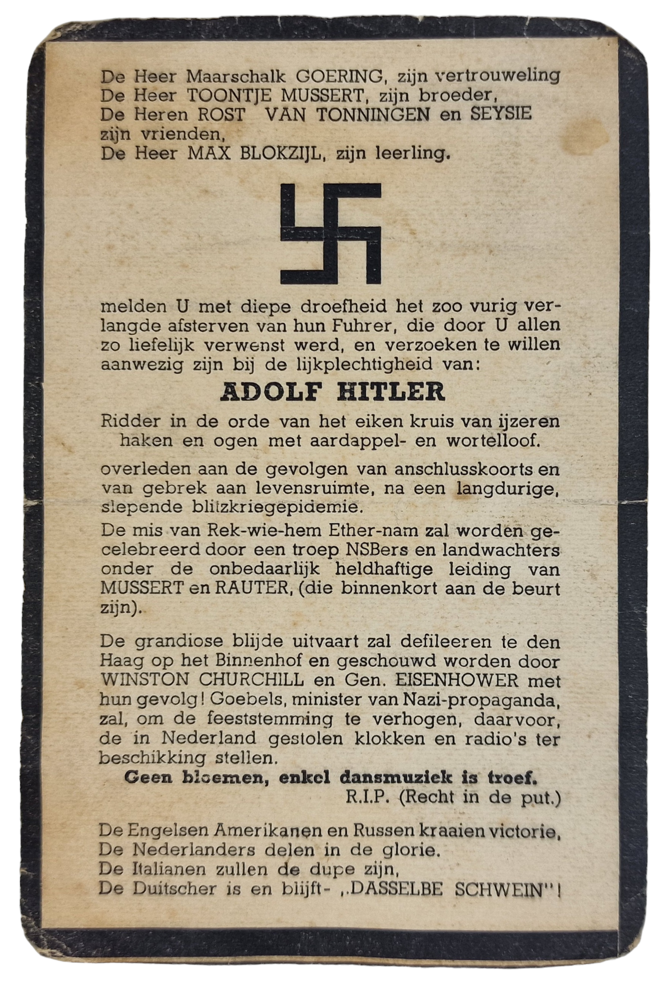 Original WW2 Dutch Liberation Document - Satirical Death Card Adolf Hitler (1945)