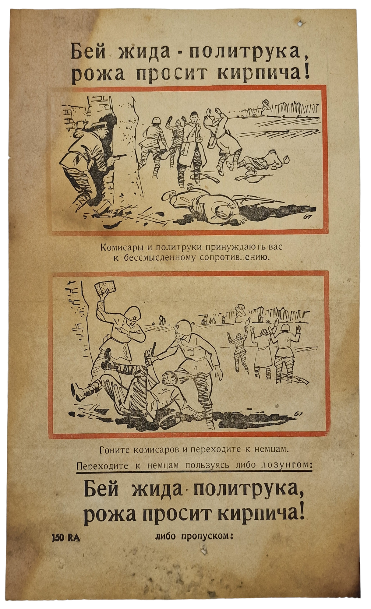 Original WW2 German Leaflet - 150 RA ''Beat the Jewish Politruk, his face is asking for a brick.'' (1941)