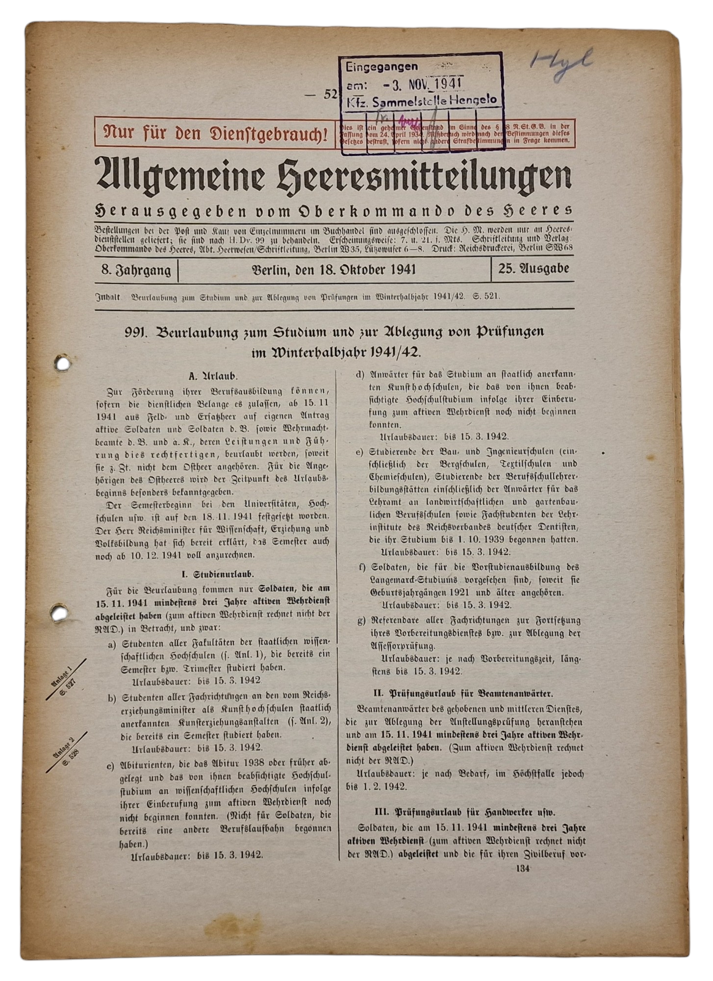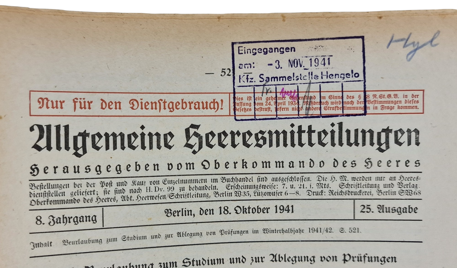 Original WW2 German Document - Allgemeine Heeresmitteilungen, 8th year No. 25, Heeres-Kraftfahrpark 559, Hengelo (1941)