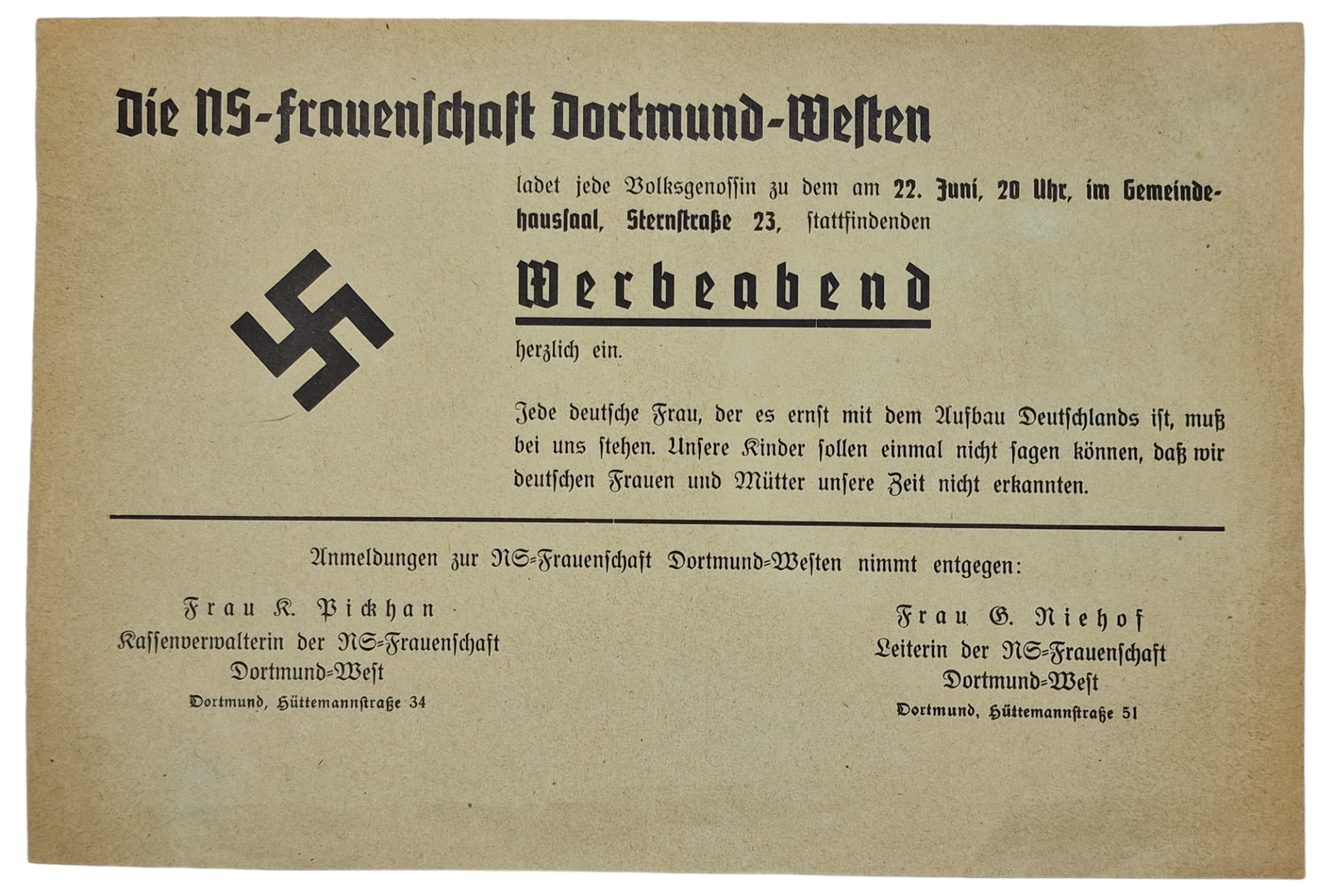 Original WW2 German Document - Die NS-Frauenschaft Dortmund-Westen Werbeabend