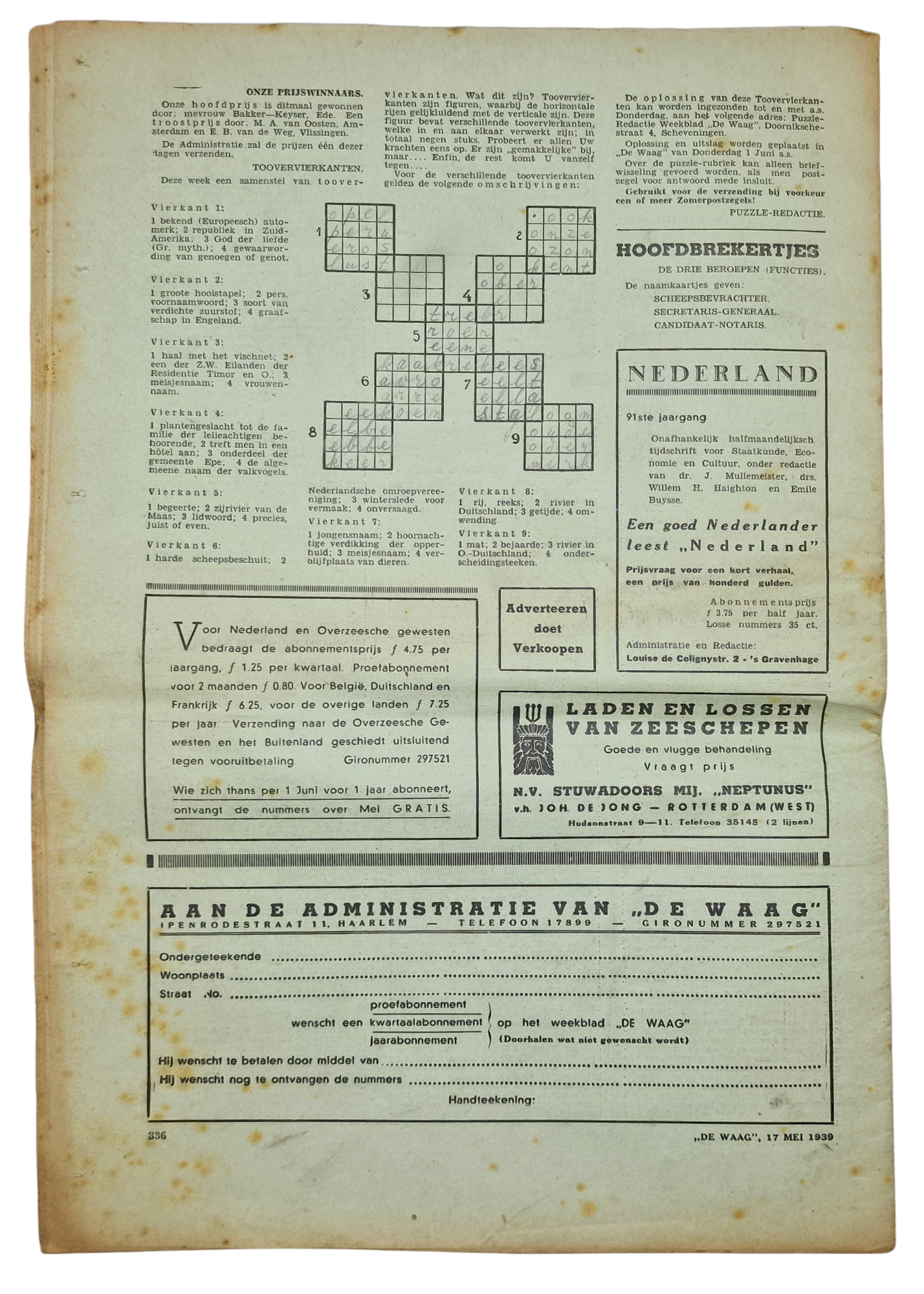 Originele Wo2 Nederlandse Collaboratie Krant - De Waag, 3rde jaargang No 20 (1939)