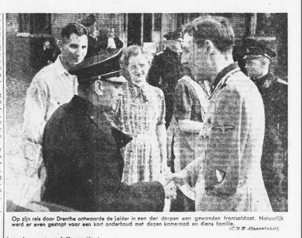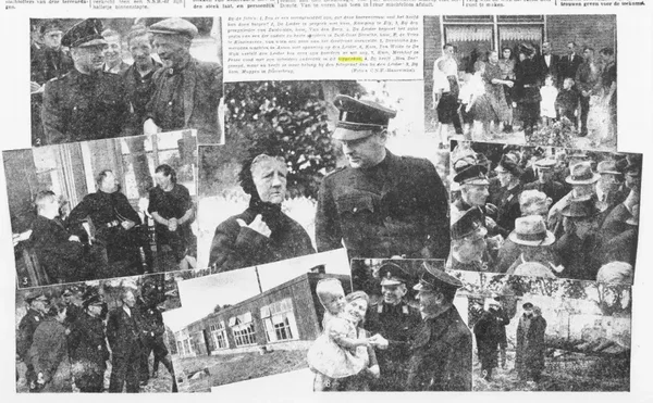 A large grouping of photos of the visit of the NSB leader Anton Mussert in Drenthe. The series starts with him visiting the ''Concert-huis'' in Assen. The WA Weerafdeling, Jeugdstorm, Nederlandsche SS, Staatspolitie, and other organizations are among the crowd. The WA Stormvlag of Meppel is visible in one of the pictures. The visit continues with Mussert meeting several local people from Drenthe including Kamping in Elp and the family de Vries in Klazinaveen. Also, some other towns in Drenthe were visited by Mussert to talk to NSB and Dutch SS members, including a Dutch volunteer soldier who had lost his arm. The visit of Drenthe was documented by the NSB newspaper Volk en Vaderland, in the 11th year No. 35. Some of the pictures in this set were also published by the newspaper.
