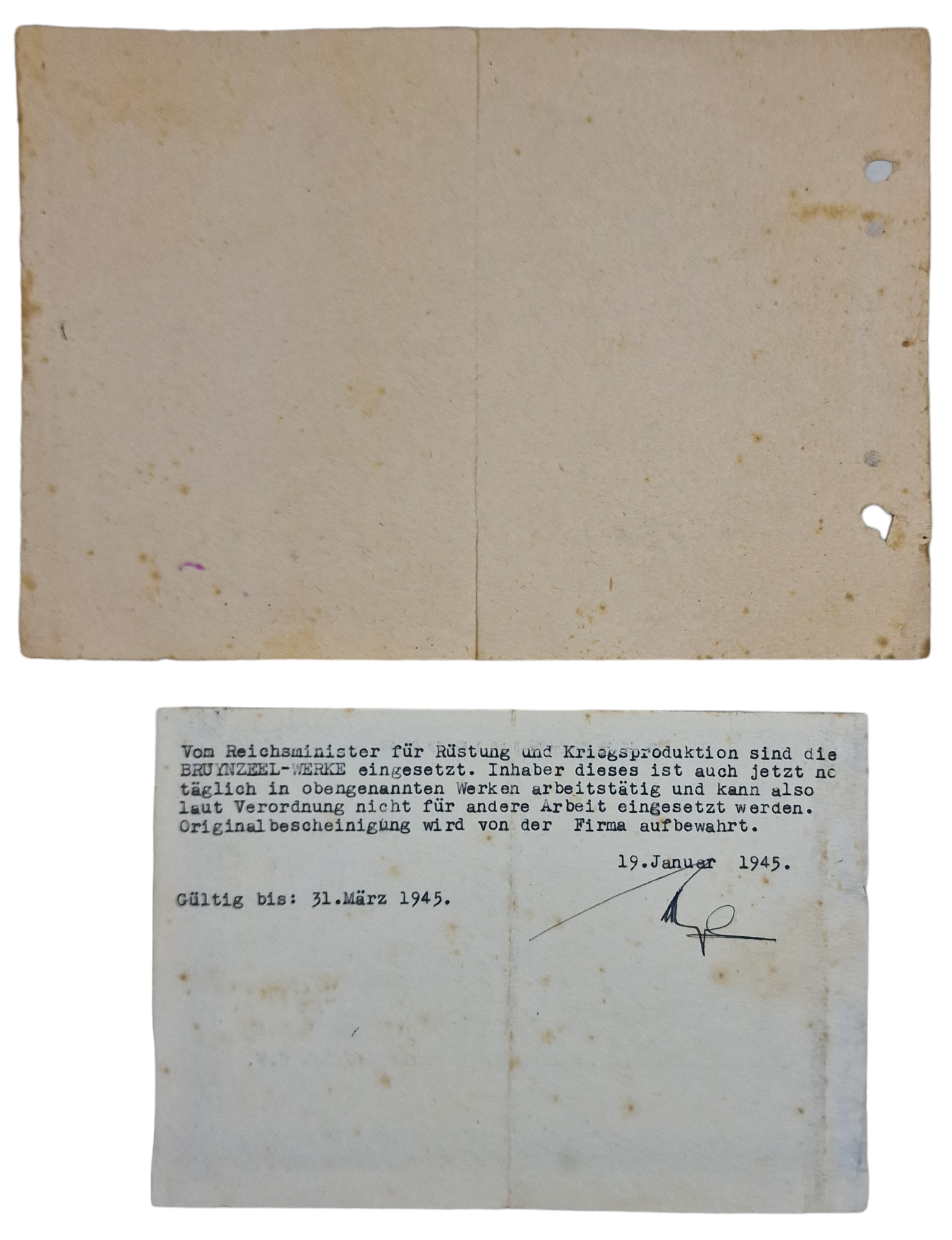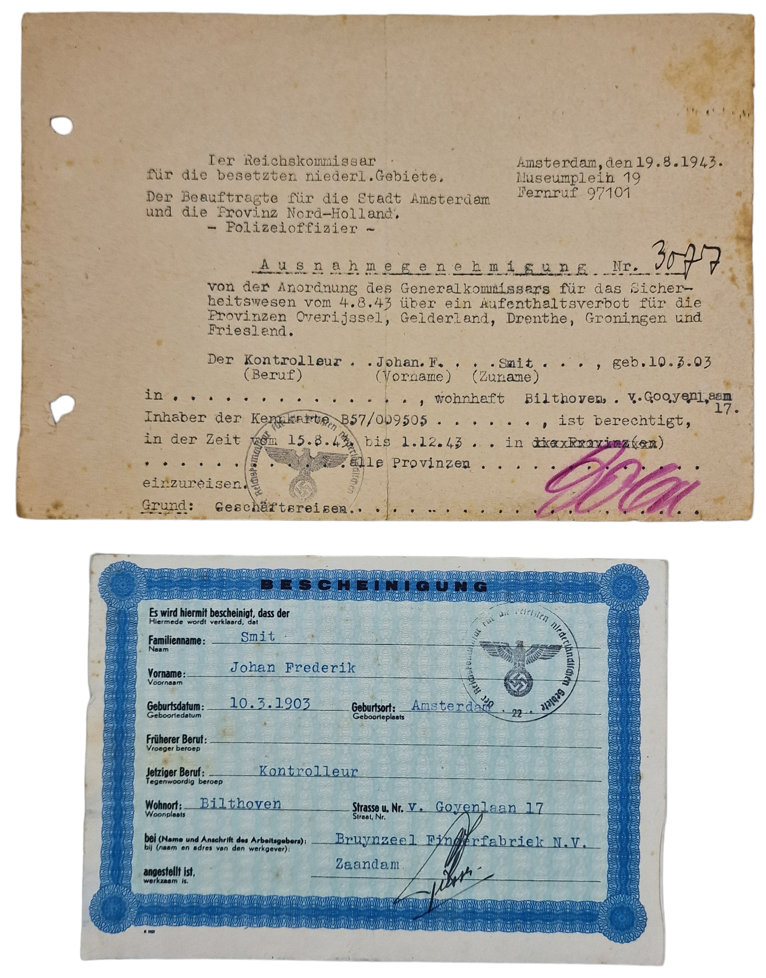 Original WW2 Dutch Document - Bescheinigung + Ausweis Bruynzeel, Bilthoven, Amsterdam (1943)