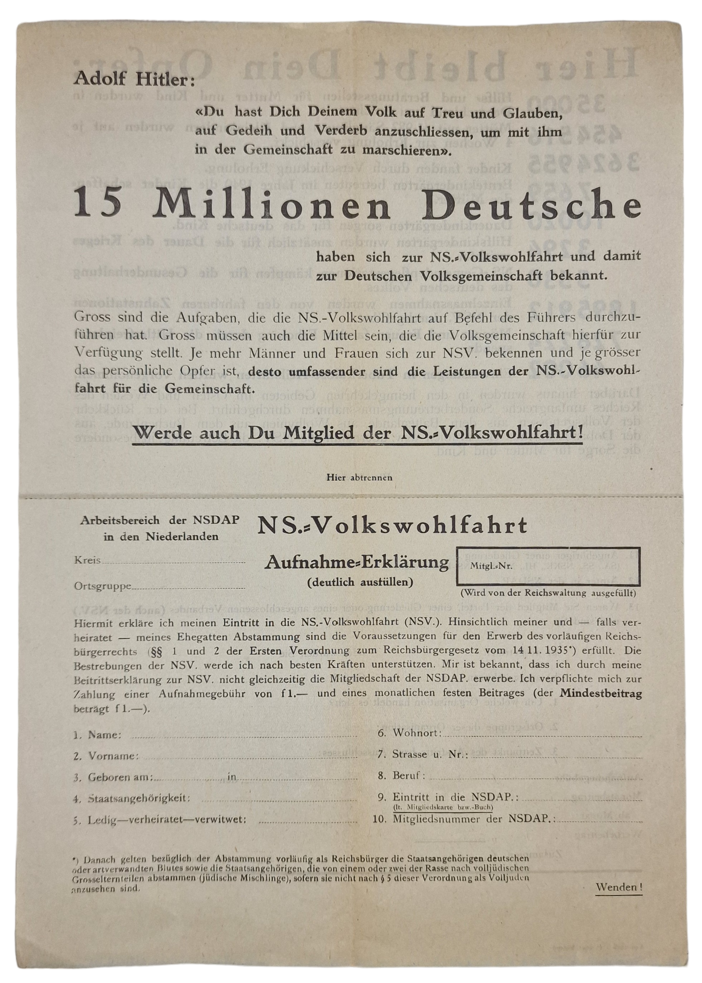 Original WW2 Dutch Collaboration NSV Document - NS Volkswohlfahrt Aufname Erklarung (1941)