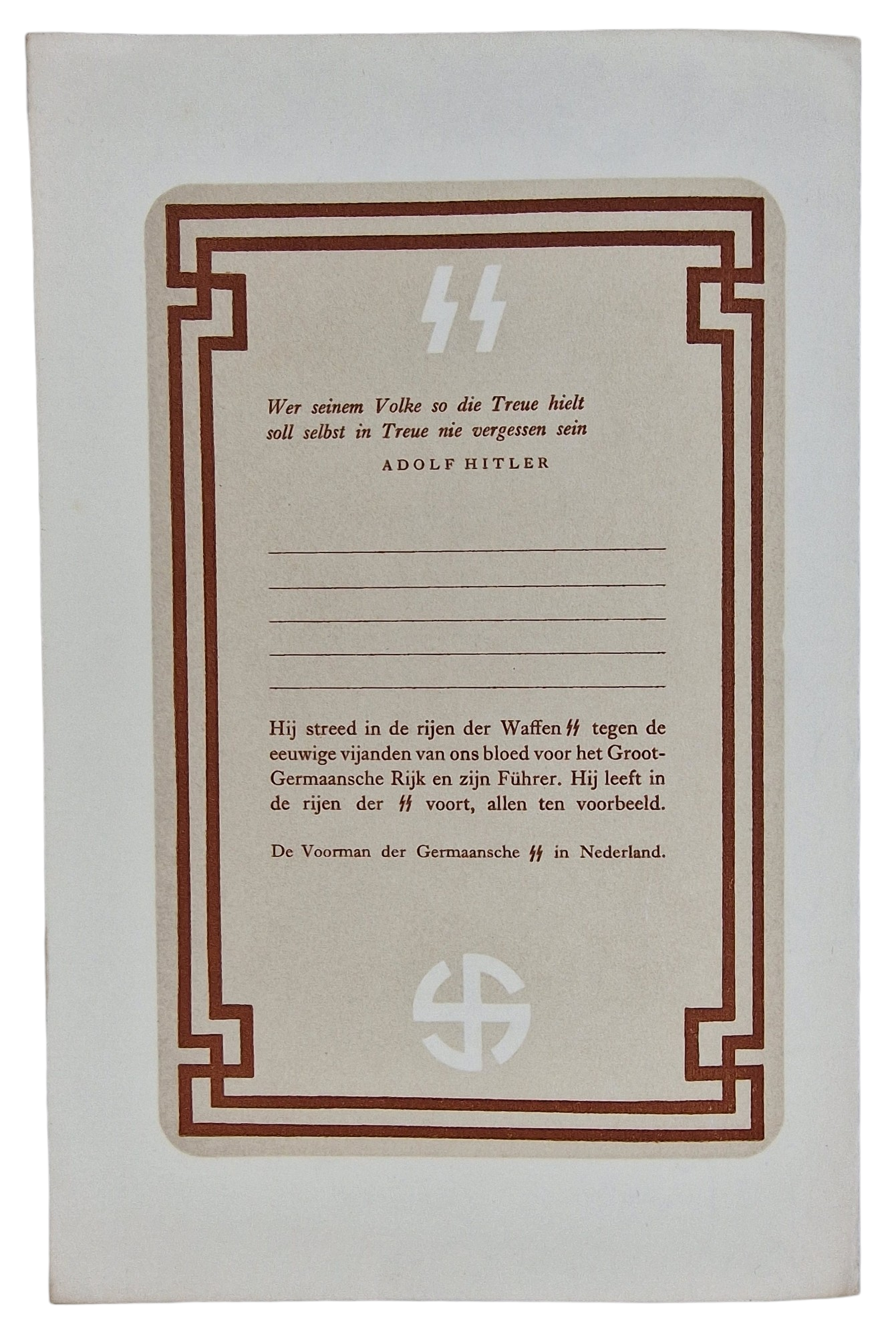 Very rare Dutch citation for the fallen soldiers at the front, with a quote from Adolf Hitler, Henk Feldmeijer, and a poem by F. C. Geitel. These citations would be given to the families of fallen Dutch SS soldiers and could be put in the book ''Onze Jongens aan het front'' by H. J. van Doornik. It is not filled in.