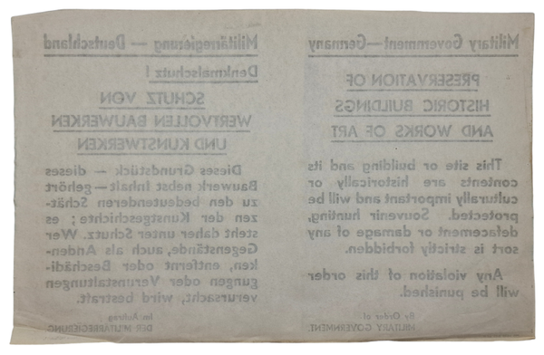 Originele Wo2 Duitse Bevrijding Poster - Military Government bekendmaking behoud historische gebouwen en kunst (1945)