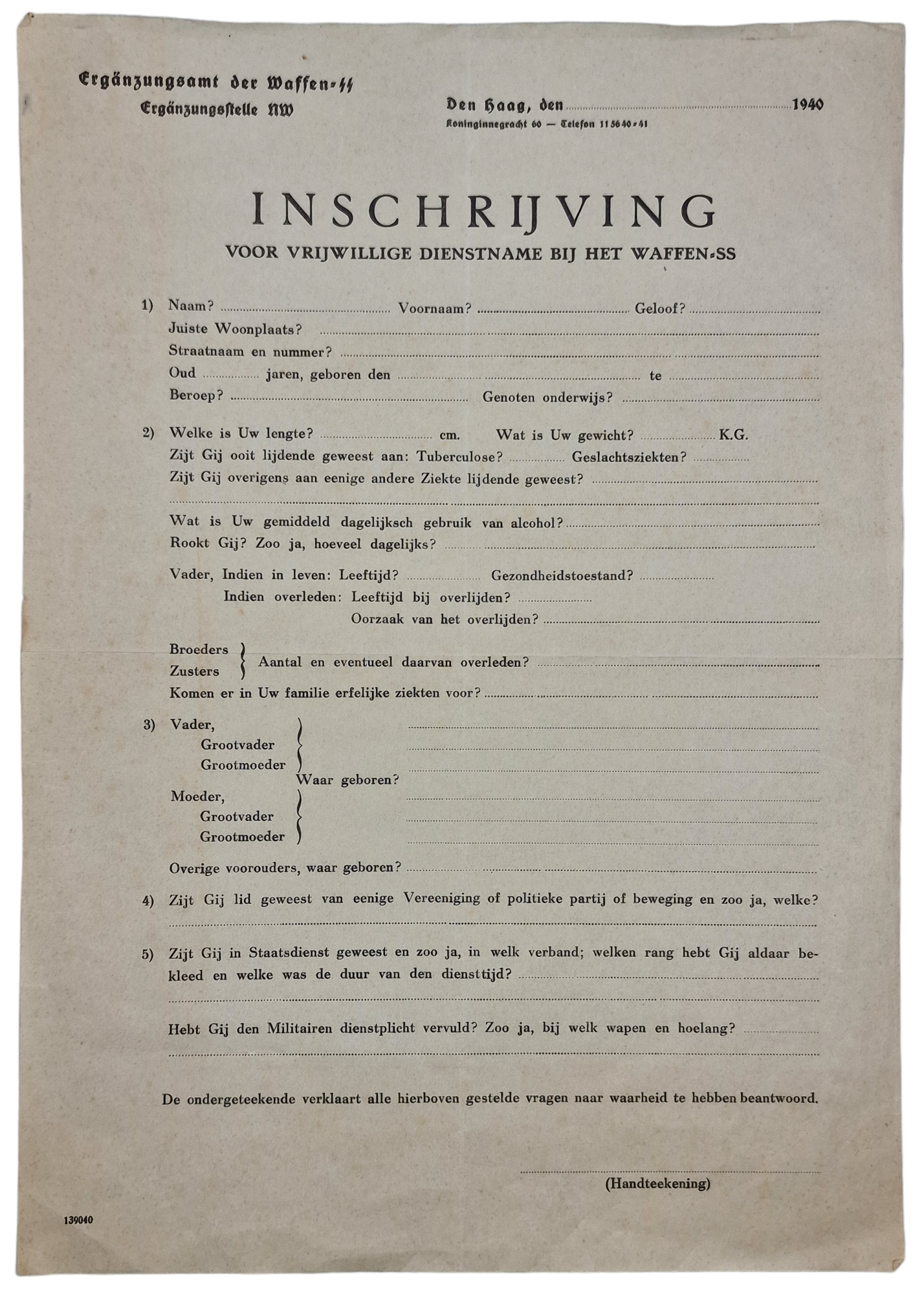 Original WW2 Nederlandse Waffen SS Vrijwilligers Document - Inschrijf formulier voor de Nederlandse Waffen SS, Den Haag (1940)