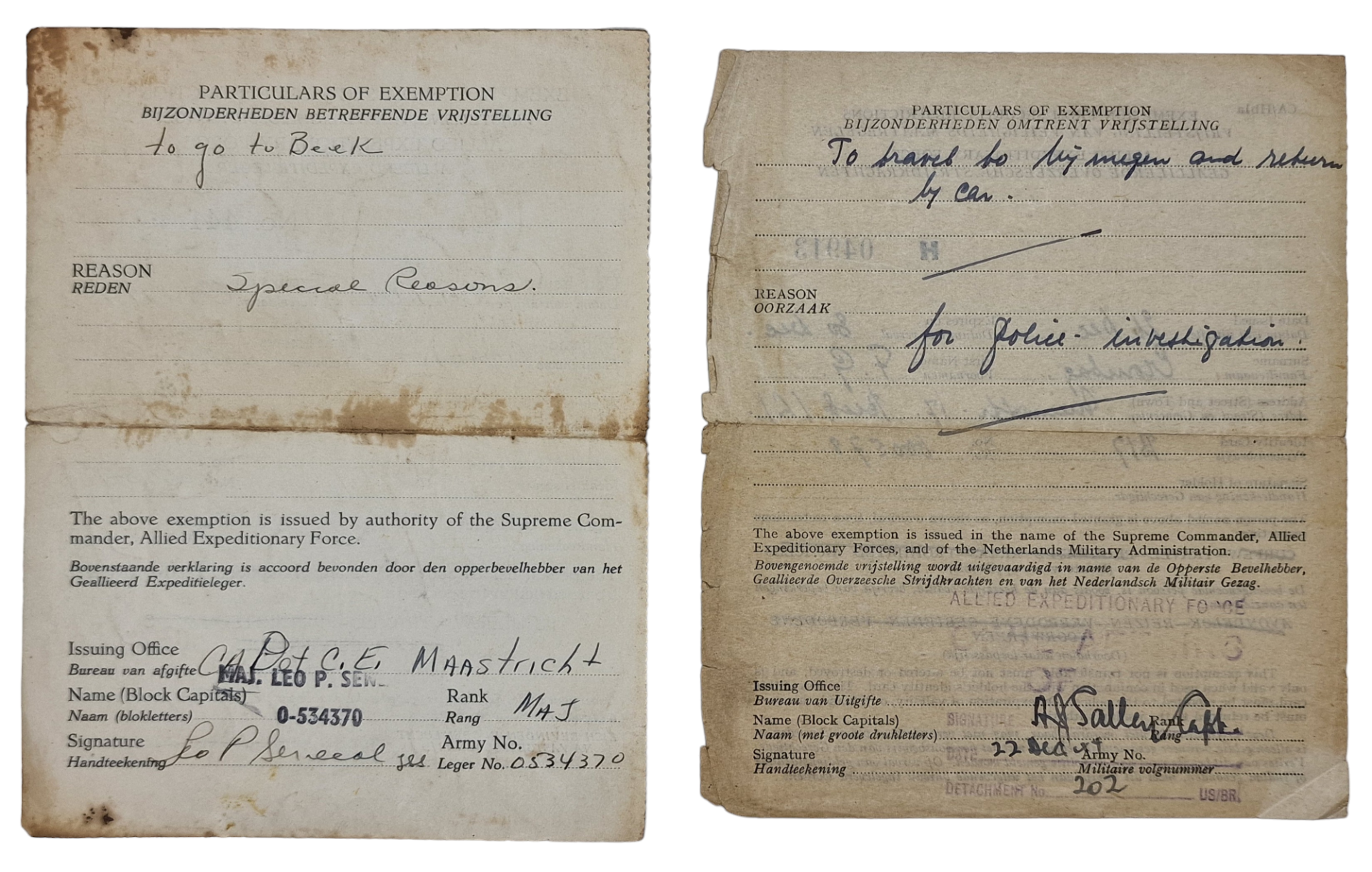 Original WW2 Dutch Document - Travel permit Beek, Nijmegen, Maastricht (1944)