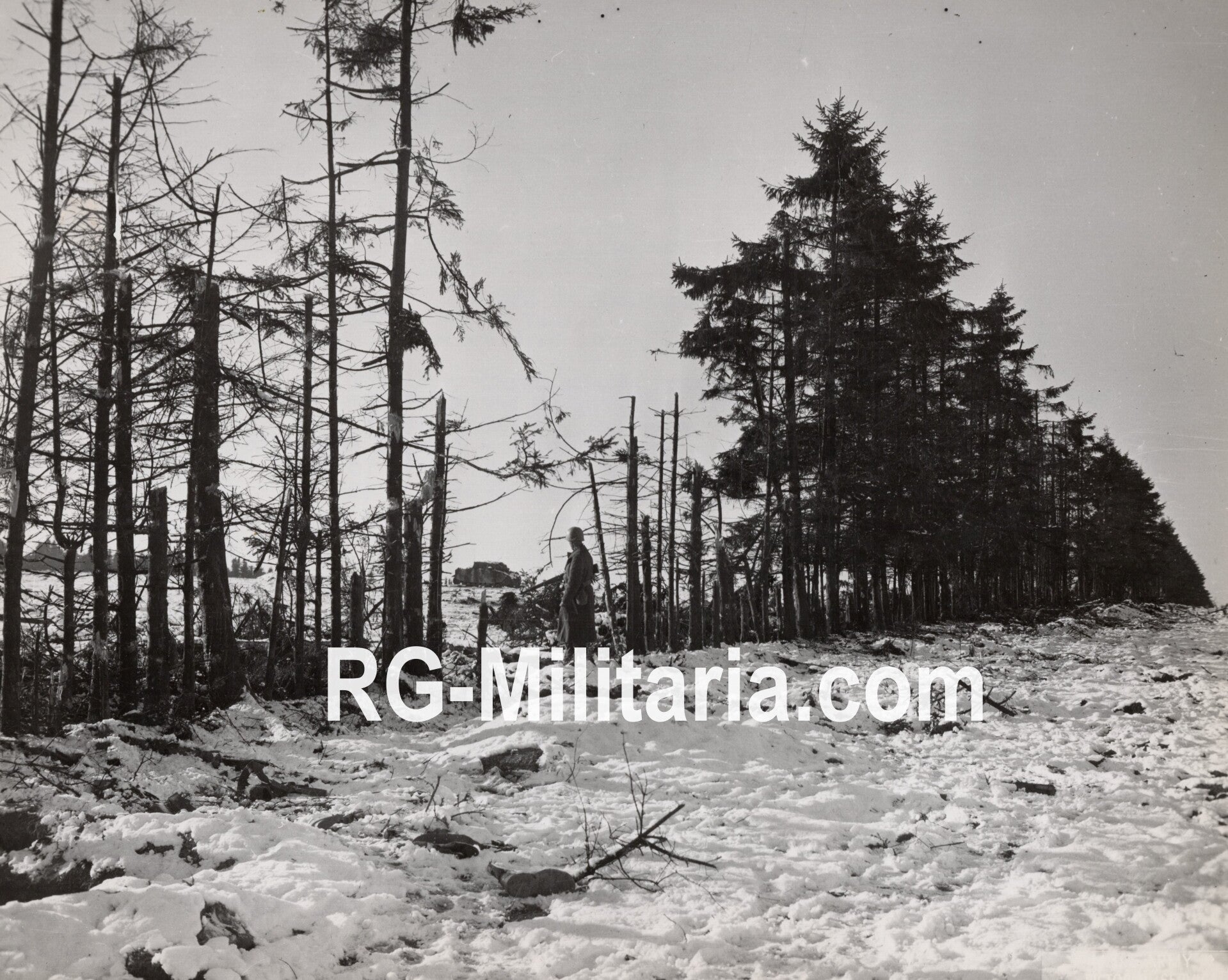 Original WW2 US Press Photo - US soldier stands guard with a German tank behind him, Belgium, Battle of the Bulge (1944)