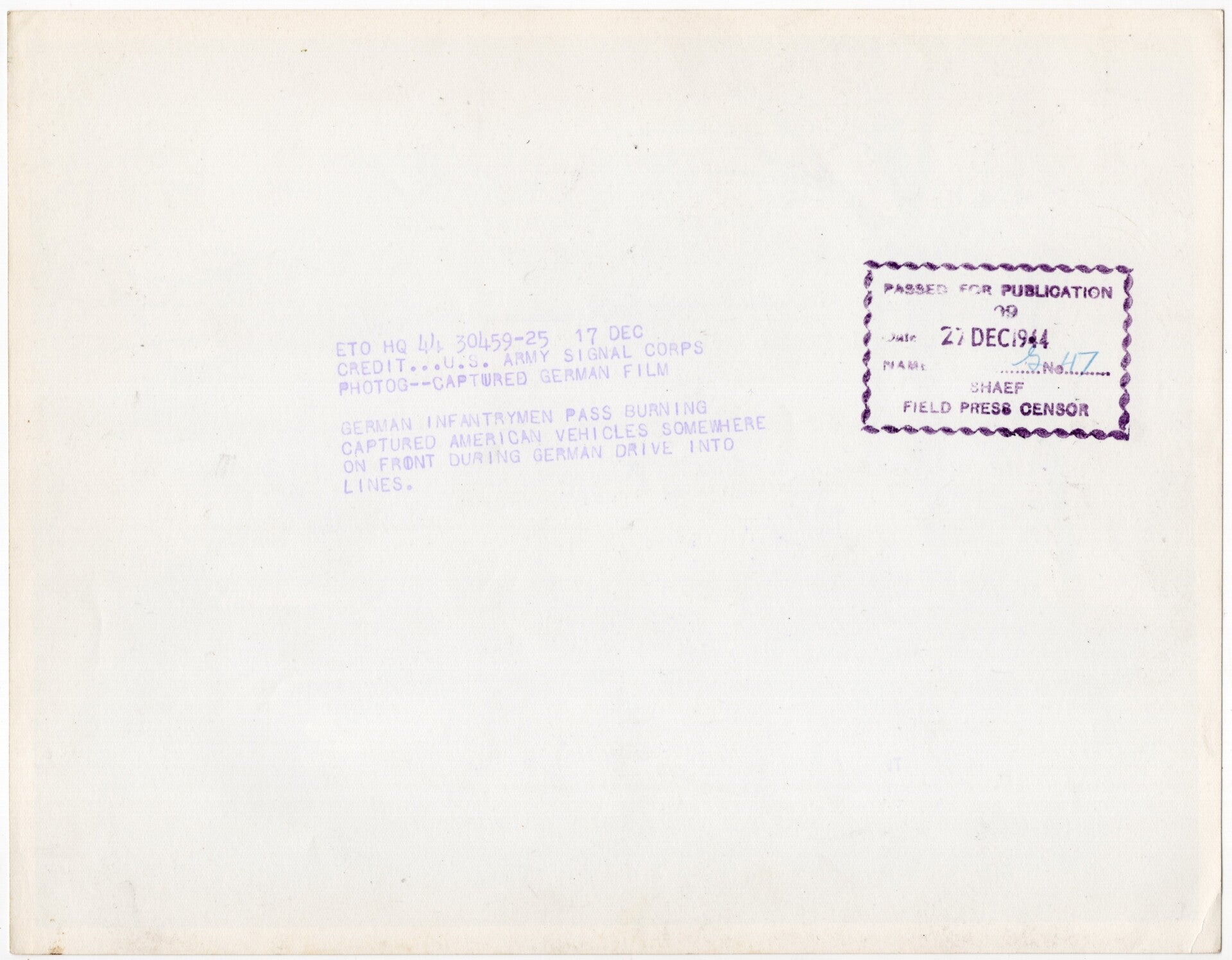 Zeer interessante still van de Duitse propagandafilm gemaakt in Poteau vlak na de hinderlaag op het C-peloton van het 32e Squadron van het Amerikaanse leger door de 1ste SS Panzer Divisie (Leibstandarte Adolf Hitler) op 18 december 1944. Op de foto loopt een gedecoreerde (met een Nahkampfspange) SS-militair richting de camera met andere SS-militairen achter hem. De militair links heeft een Sturmgewehr STG 44. Aan de rechterkant zijn een Jeep en een brandende Amerikaanse Halftrack zichtbaar.
