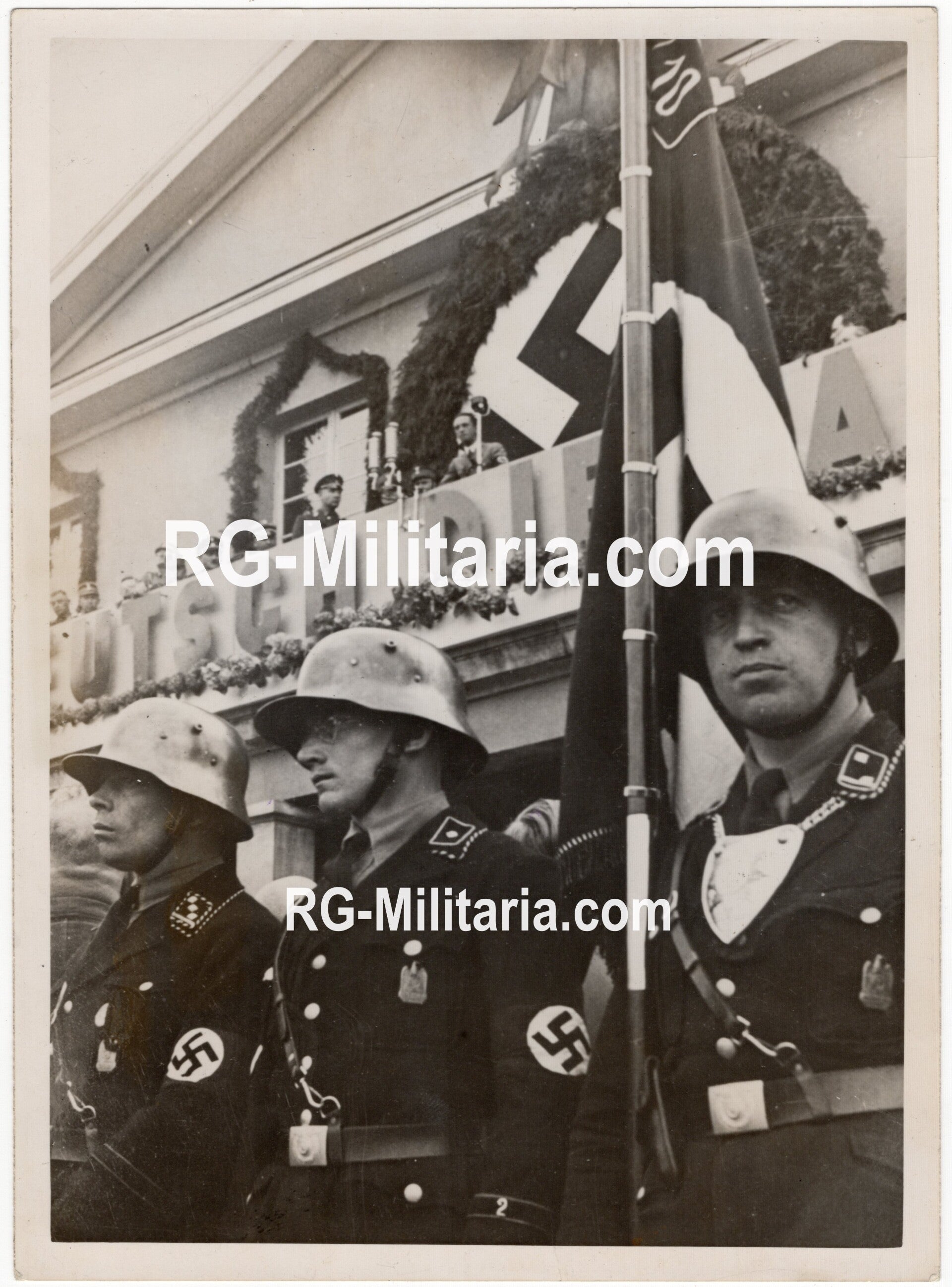 Original WW2 French Press Photo - Allgemeine SS ''2'' with SS flagbearer gorget, Joseph Goebbels speech
