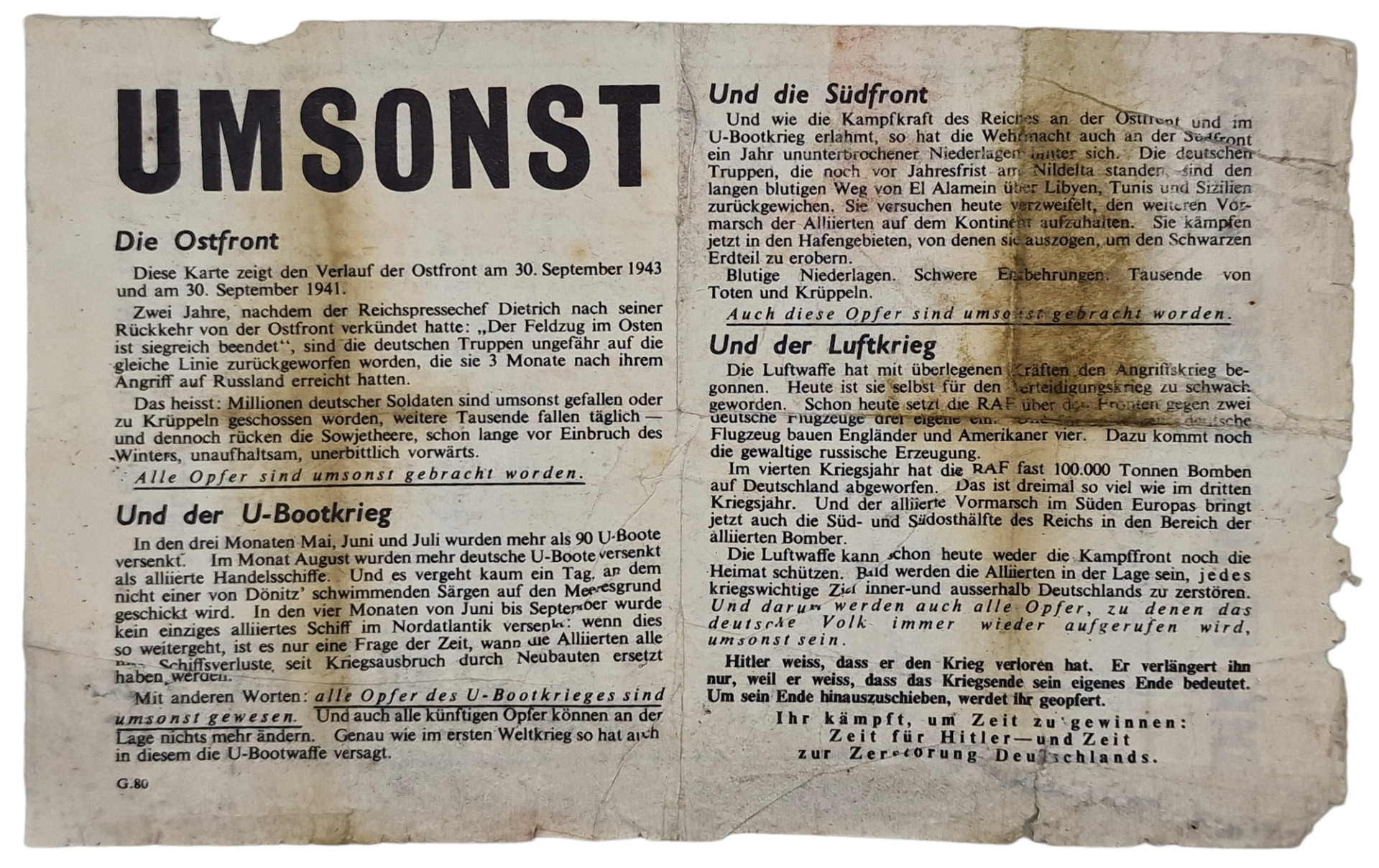 Original WW2 British Leaflet - G 80 Die Front Rückt Näher (1943)