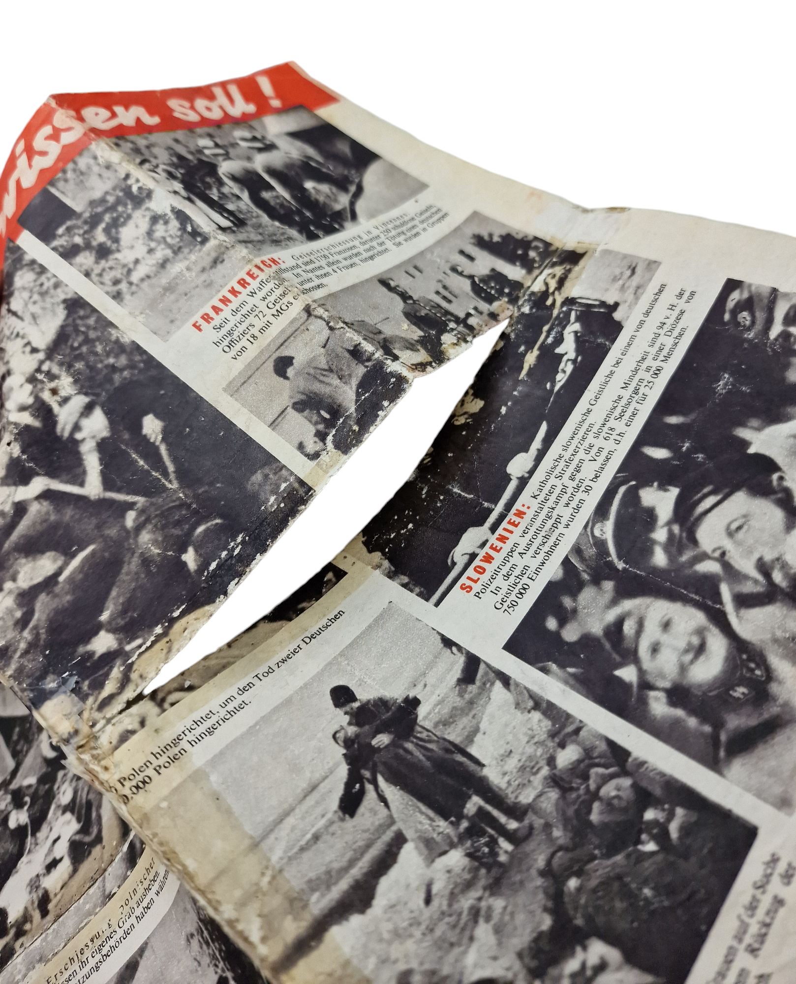 British leaflet for German civilians. Very graphic, one of the few leaflets showing the scenes done to eastern European and Jewish people. This leaflet is in bad condition, and torn in the middle and taped.