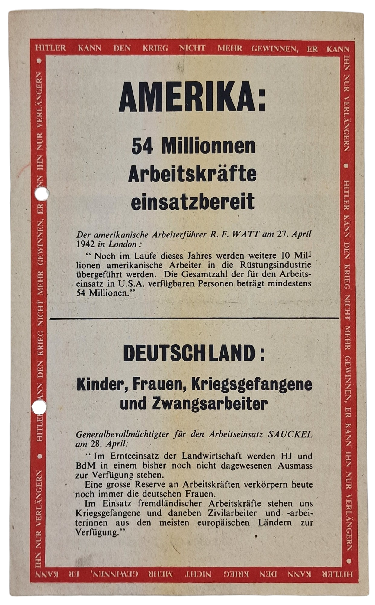 Original WW2 British Leaflet - G 23 Amerika: 54 Millionnen Arbeitskräfte (1942)