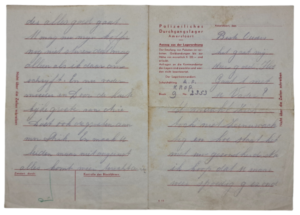 Original WW2 German Concentration Camp Letter - Dutch prisoner in Polizeiliches Durchgangslager Amersfoort (1944)