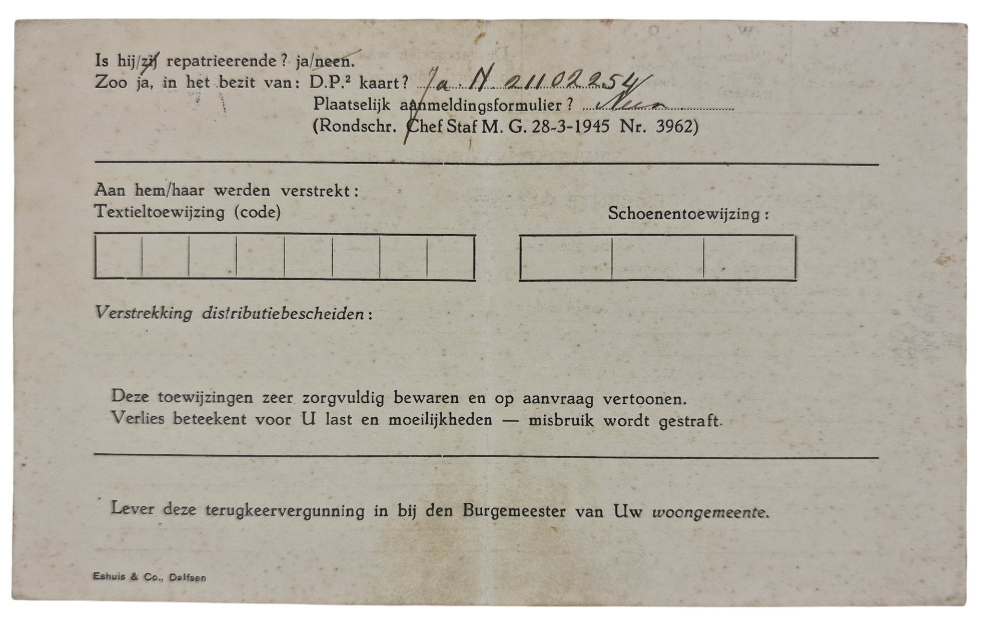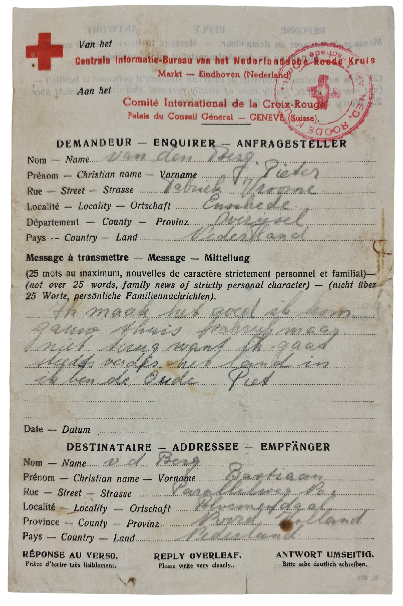 Pieter van den Berg was born in Velsen in 1923, and he lived in Bloemendaal during the war. In 1944 he arrived in the Concentration camp Buchenwald after being transported from Concentration Camp Amersfoort. Before that, he was in the Sicherheitspolizei prison in The Hague. This set consists of three letter written by him and two documents from his way back home. One Red Cross letter to his family written from Enschede that he is coming home soon, and one permit of return stamped in Dalfsen.
