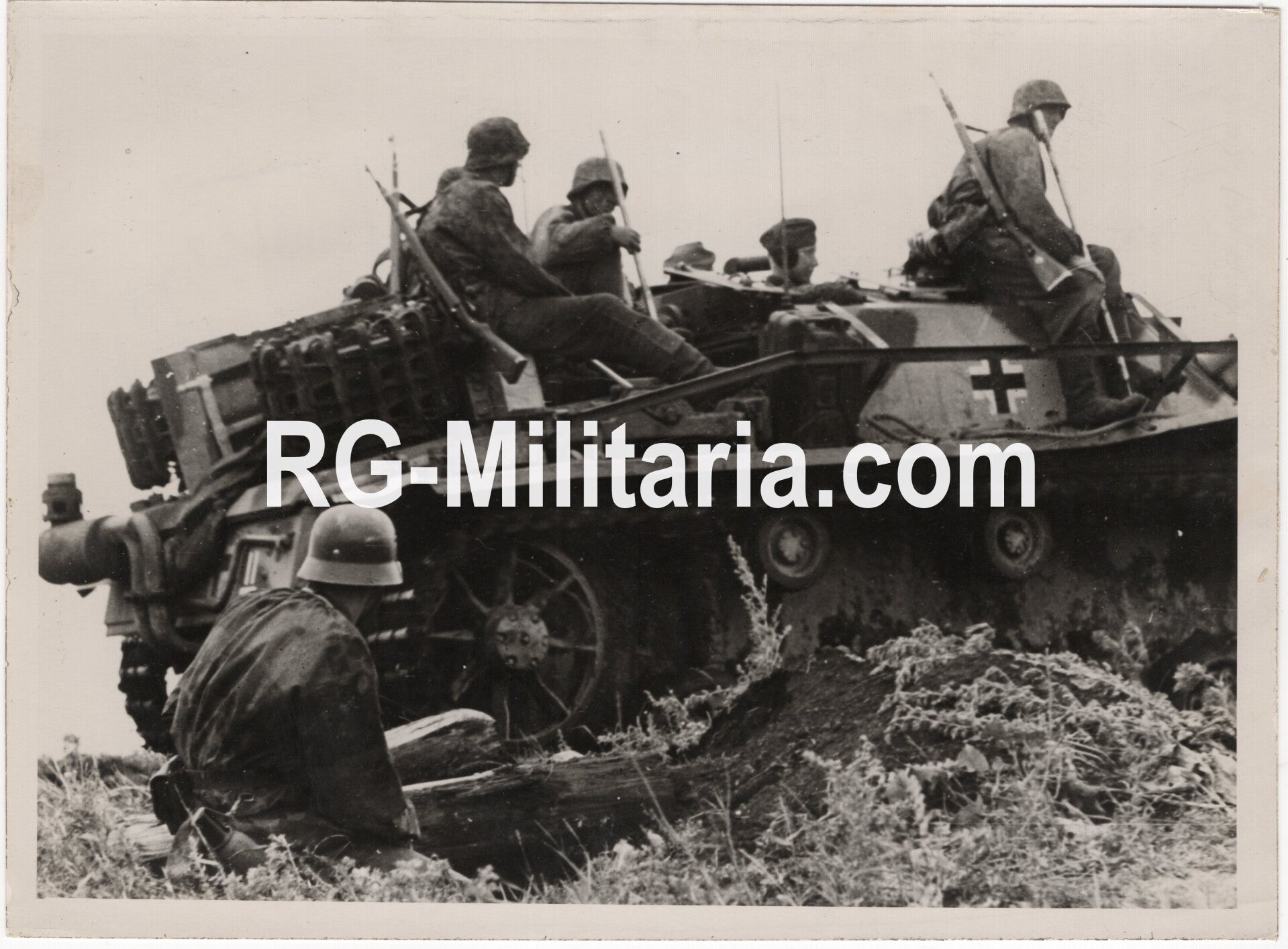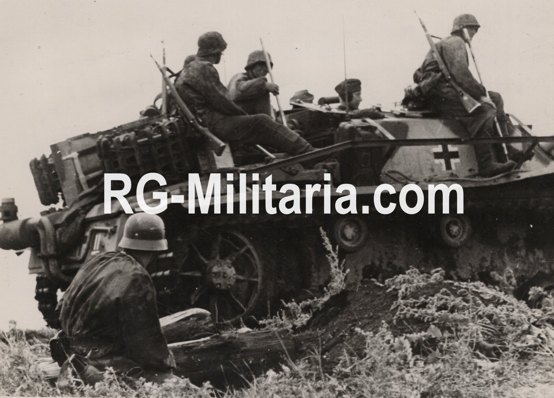 Original WW2 German Waffen SS Press Photo - SS soldiers on a German Panzer Tank, Stug, Eastern Front (1943)