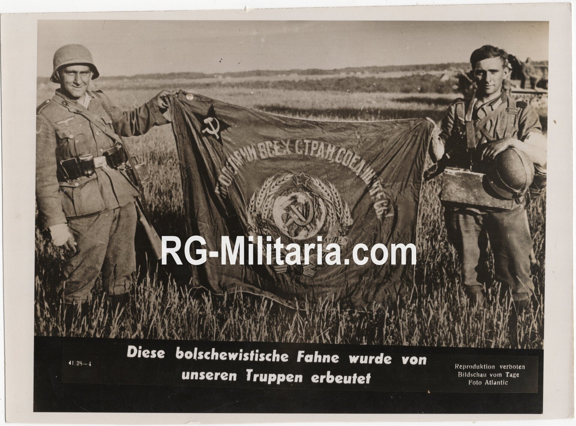 Original WW2 German Press Photo - German soldiers with a captured Soviet flag (1941)