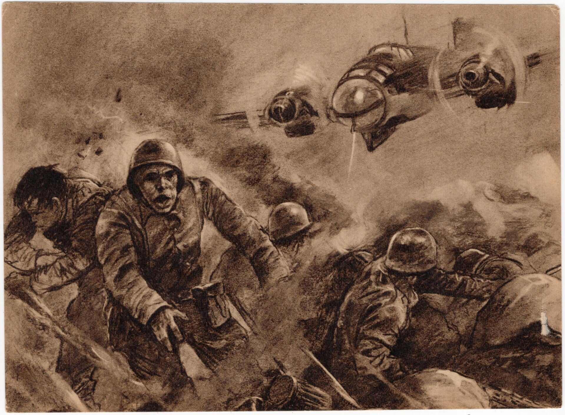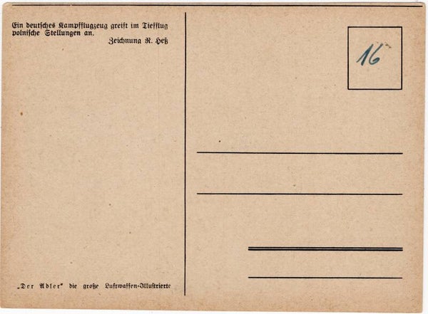 Original WW2 German Postcard - ''Ein Deutsches Kampfflugzeug greift im Tiefflug Polnische Stellungen an''
