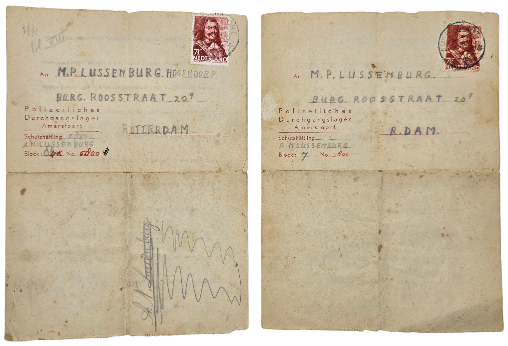 Twee brieven van een Nederlandse gevangene uit Rotterdam, geboren in 1907. In januari 1944 werd hij naar het concentratiekamp PDA Amersfoort gestuurd. In oktober 1944 werd hij gedeporteerd naar het concentratiekamp Neuengamme in Duitsland. Hij stierf daar in de Kdo. Meppen-Versen in januari 1945.