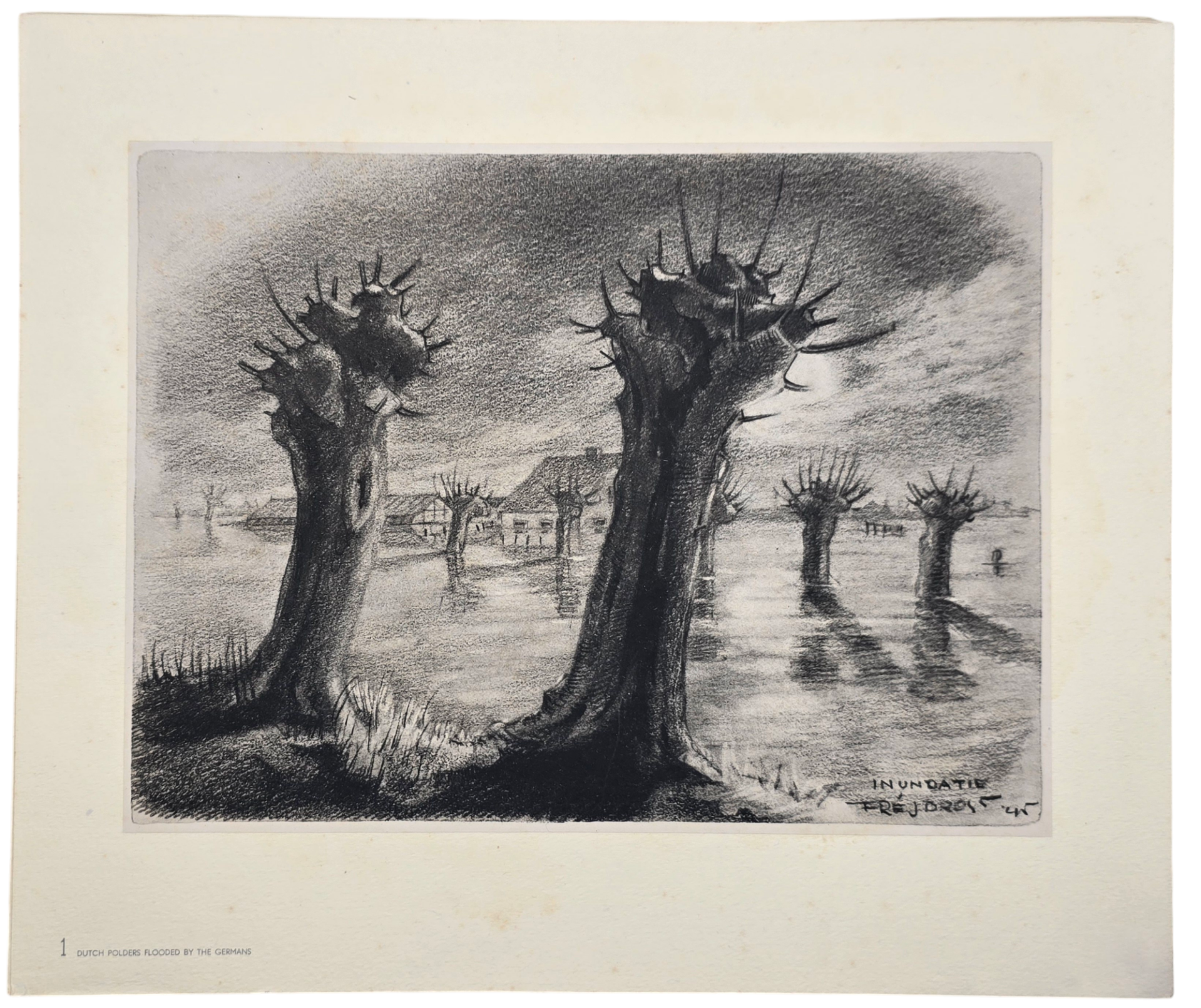 This is a litho portfolio given to workers of the Swedish Red Cross for their help during the Warwinter in Holland. The lithos were made by Fré J. Drost and published by N.V. Drukkerij & Advertentiebureau Reclame in Rotterdam in 1945. They have made 200 Dutch editions and just 50 English editions. This is number 32 of the 50 English ones. There are 14 lithos in the folder.