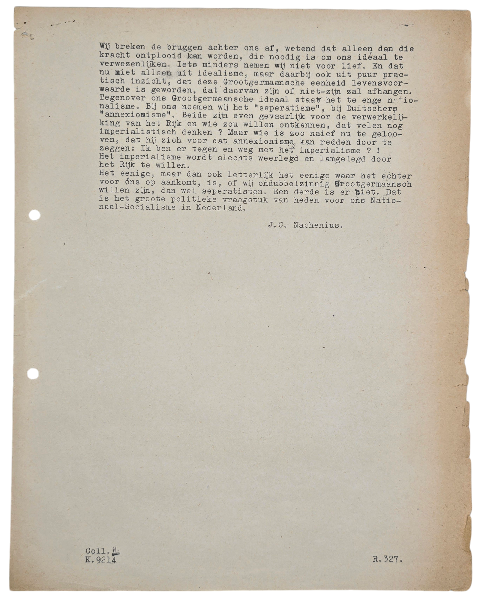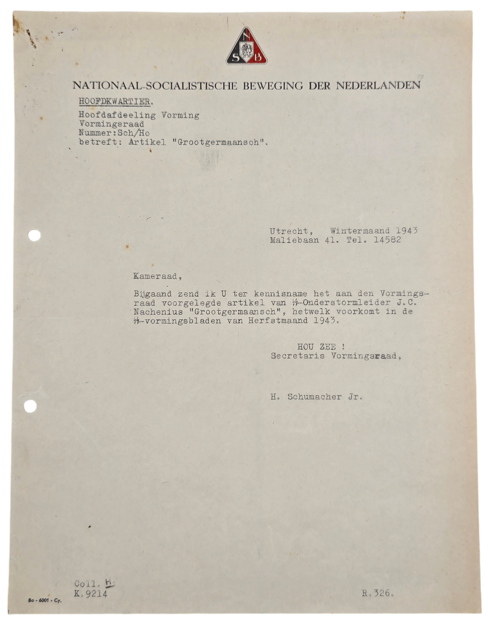 Letter by Henk Schumacher Jr. about a new article for the SS-Vormingsbladen written by J. C. Nachenius called ''Grootgermaansch'' in 1943. Henk Schumacher worked for the redaction of the SS Vormingsbladen. It includes the article of Nachenius, the paper is fragile.