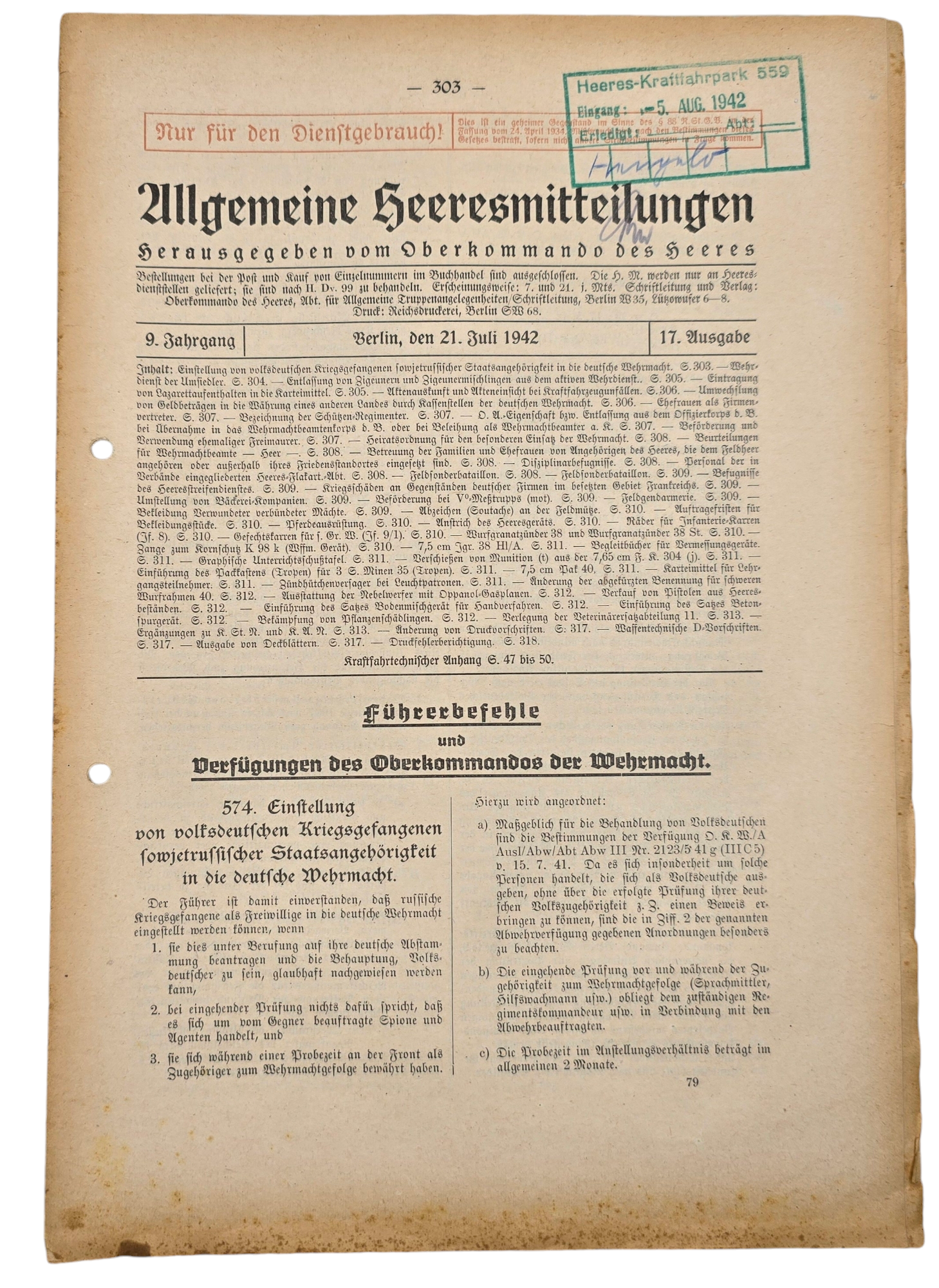 Original WW2 German Document - Allgemeine Heeresmitteilungen, 9th year No. 17, Heeres-Kraftfahrpark 559, Hengelo (1942)