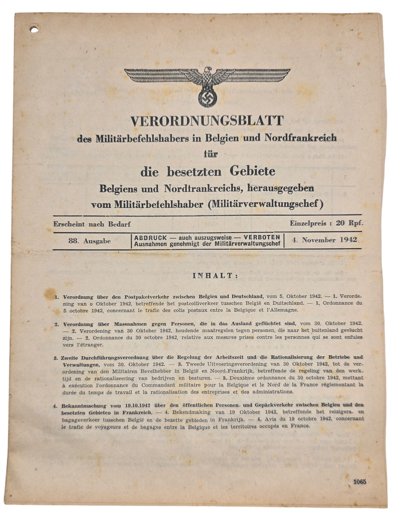 Origineel Wo2 Duits Document - Verordnungsblatt des Militärbefehlshabers in Belgien und Nordfrankreich, 88 ausgabe (1942)