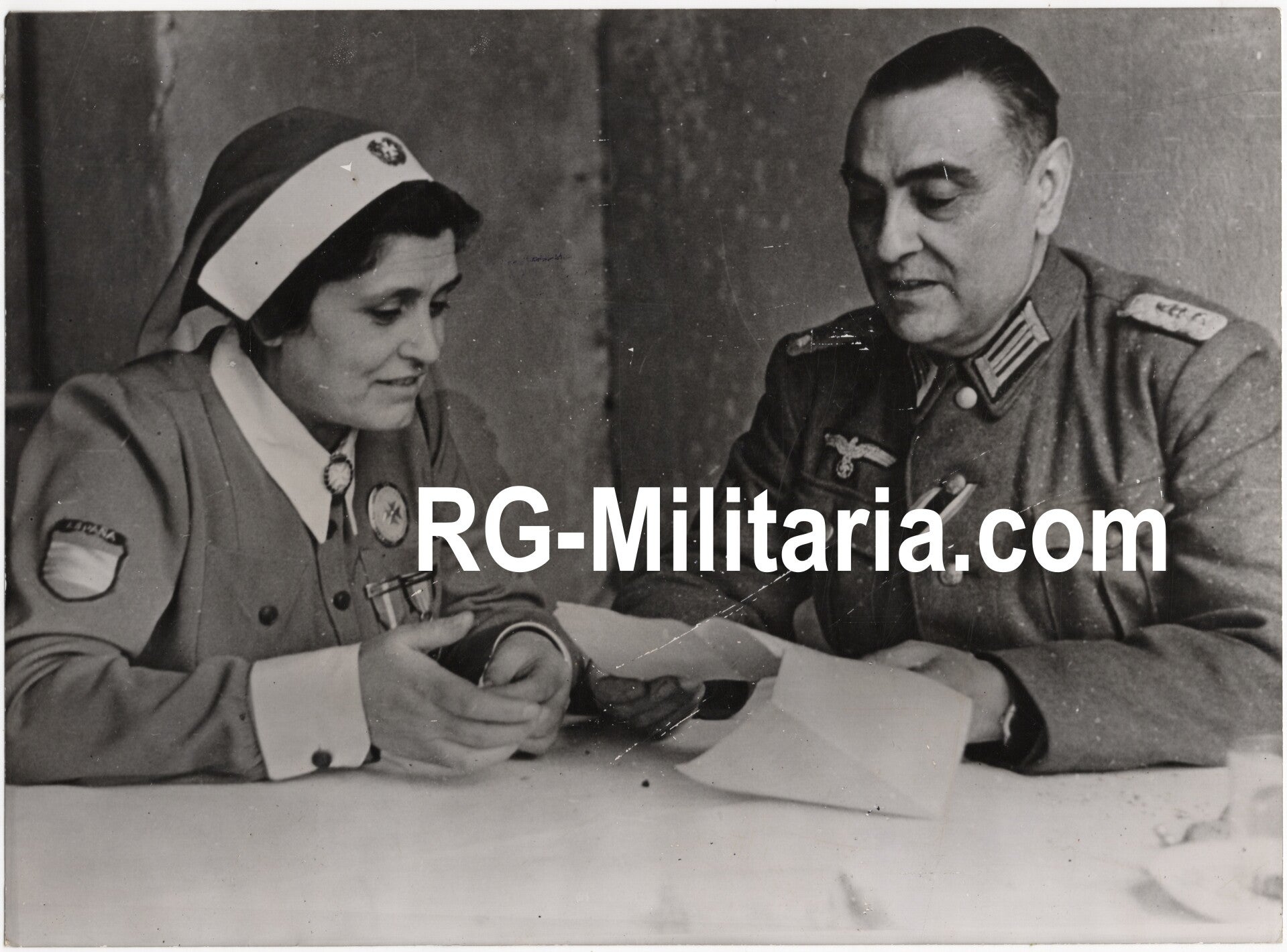 Original WW2 Italian Press Photo - Spanish Blue Division Red Cross volunteer Mercedes Mila with a Wehrmacht medic (1943)