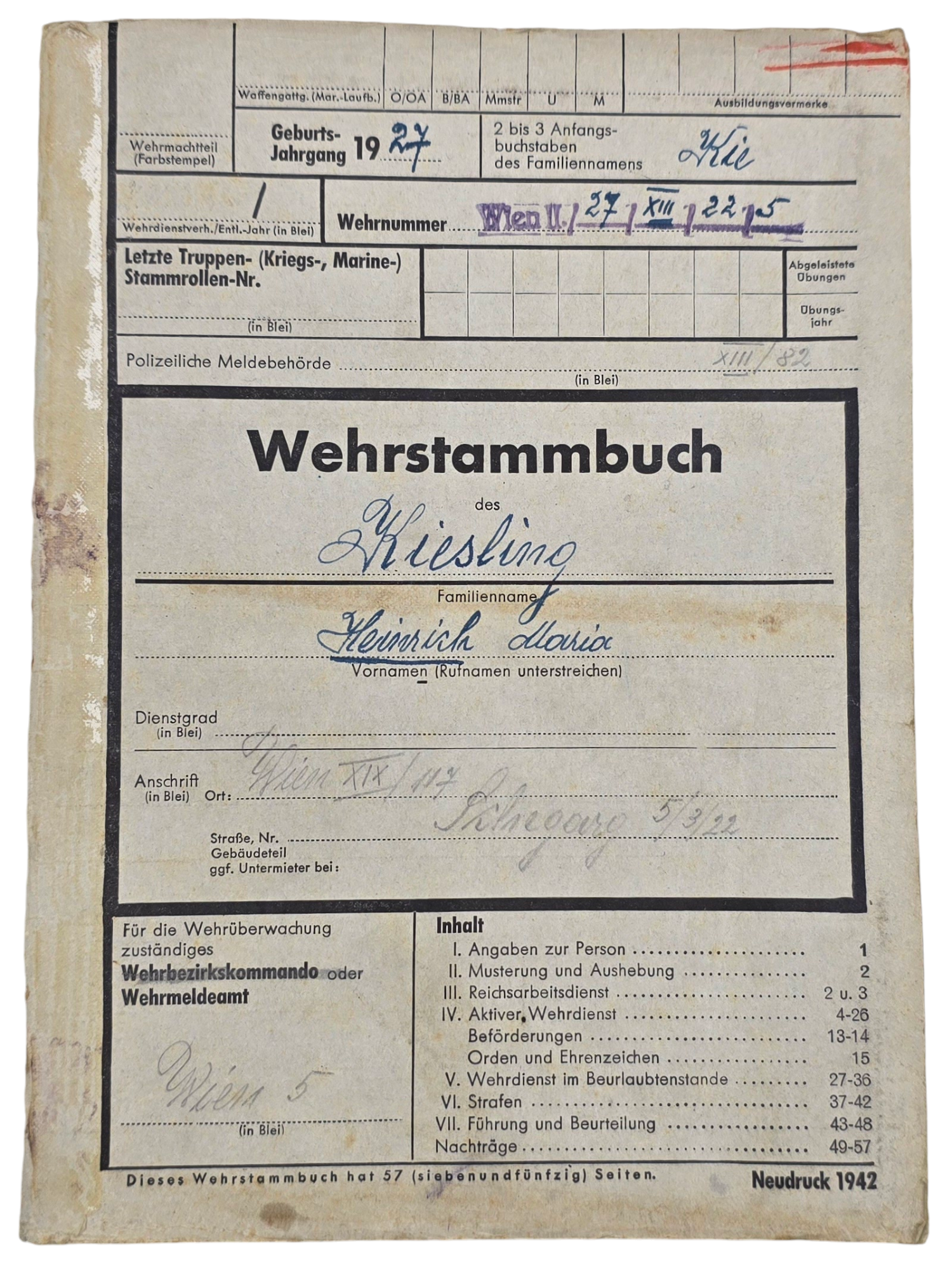 Wehrstammbuch van een Duitse RAD militair die geboren was in Tilburg, Nederland. Zijn ouders waren Duitsers dus daarom moest hij in dienst. Hij is geboren in 1927 en ging in 1944 bij de RAD, toen hij 17 jaar oud was. Er zitten 5 documenten bij de Wehrstammbuch plus een foto van de jongen. De kaft van de Wehrstammbuch zit los.