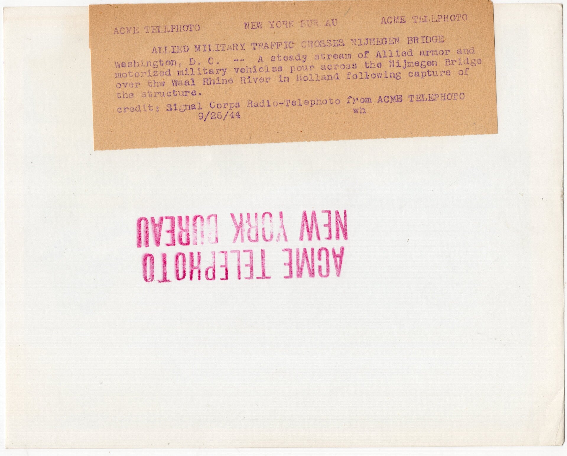 Originele Wo2 Amerikaanse Persfoto - Geallieerde militaire voertuigen rijden de Nijmegen Waalbrug over, Operatie Market Garden (1944)