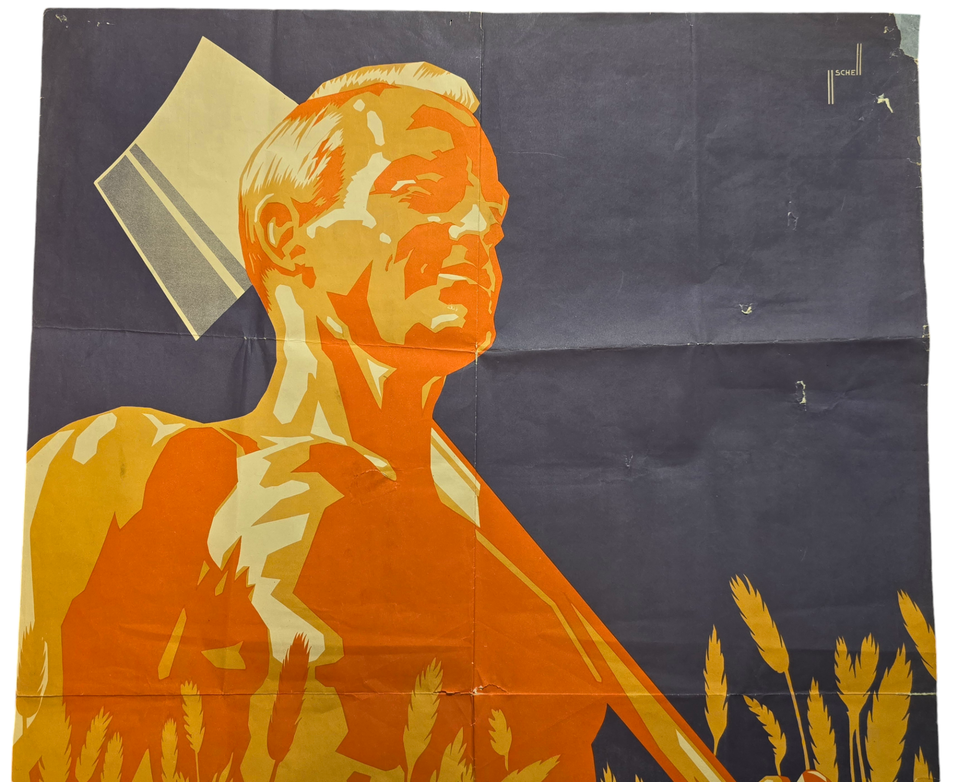 Poster as a call to sign up for the Dutch labour service. Repaired with acid-free tape and bookbinder glue. Damaged condition, see photos. Some areas of the poster are a bit thinner because of damage, this is not visible when framed.