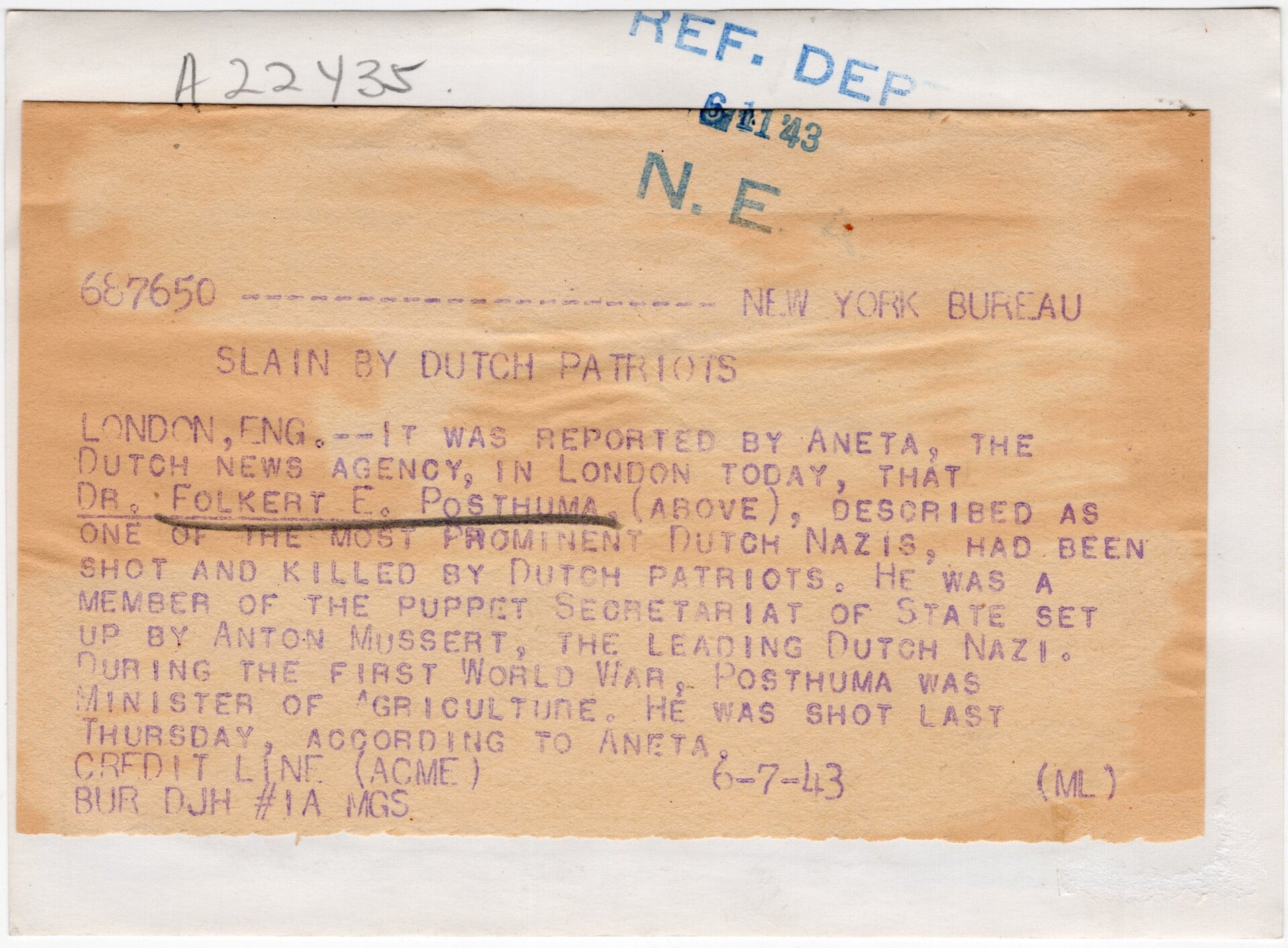 Originele Wo2 Amerikaanse Persfoto - Portret van Nederlandse minister Dr. Folkert Posthuma, vermoord door CS-6 (1943)