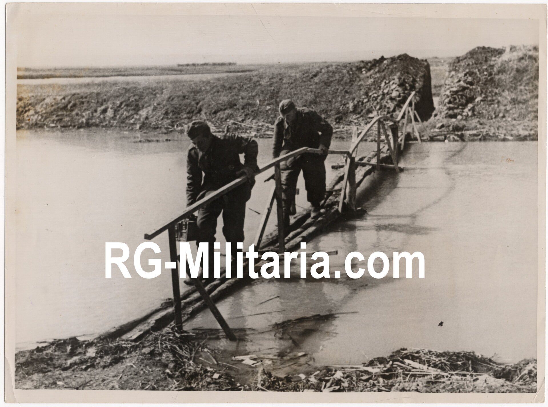 Originele Wo2 Duitse Persfoto - Duitse Gebirgsjäger militair lopen over een brug bij Kuban, Oostfront (1943)