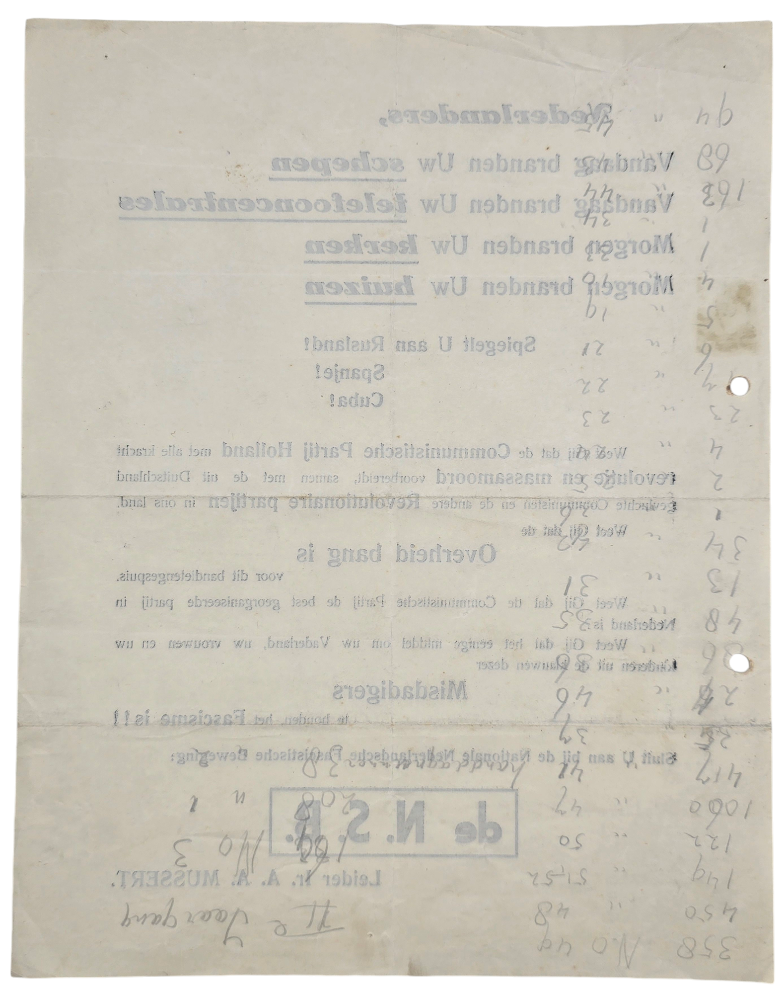 Original WW2 Dutch Collaboration NSB Document - Anticommunist flyer, Nederlanders, Vandaag branden uw schepen, A. A. Mussert