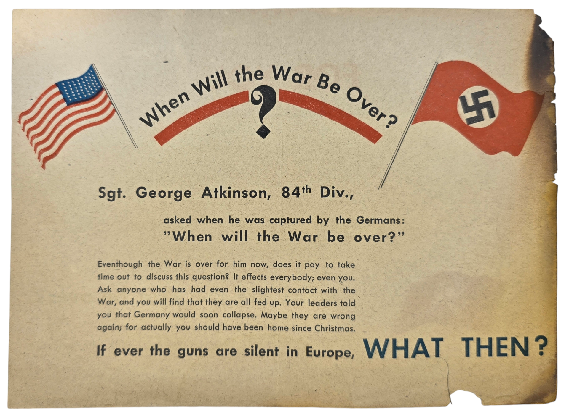 Original WW2 German Leaflet - 648 SK 1C When will the war be over? 84th Div George Atkinson