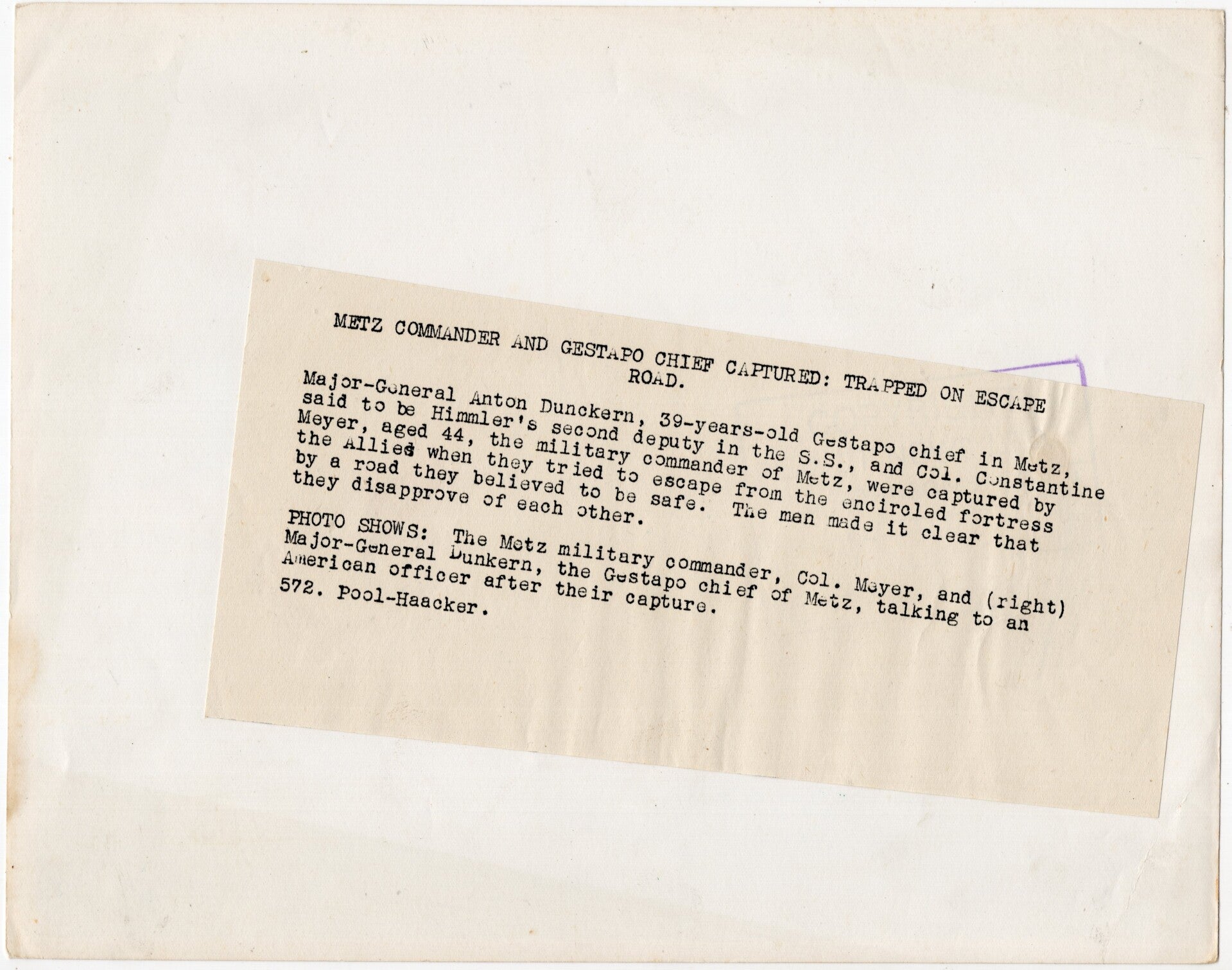 Na een paar maanden harde oorlogsvoering lukte het de geallieerden eindelijk om Metz te bevrijden. Oberst Constantine Meyer was een Duitse commandant in Metz. SS Brigadeführer Anton Duckern (rechts) was leidinggevende van de SS en politie in Metz. Na zijn gevangenneming heeft Generaal George Patton hem persoonlijk verhoord.