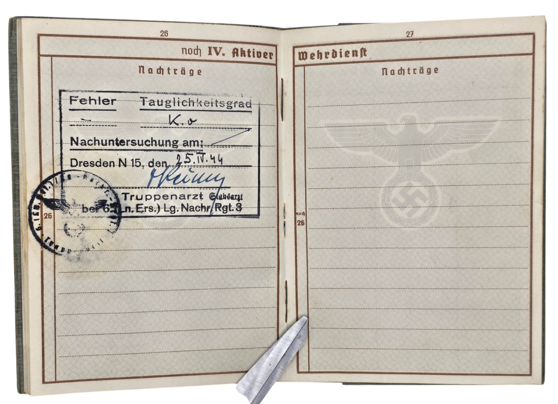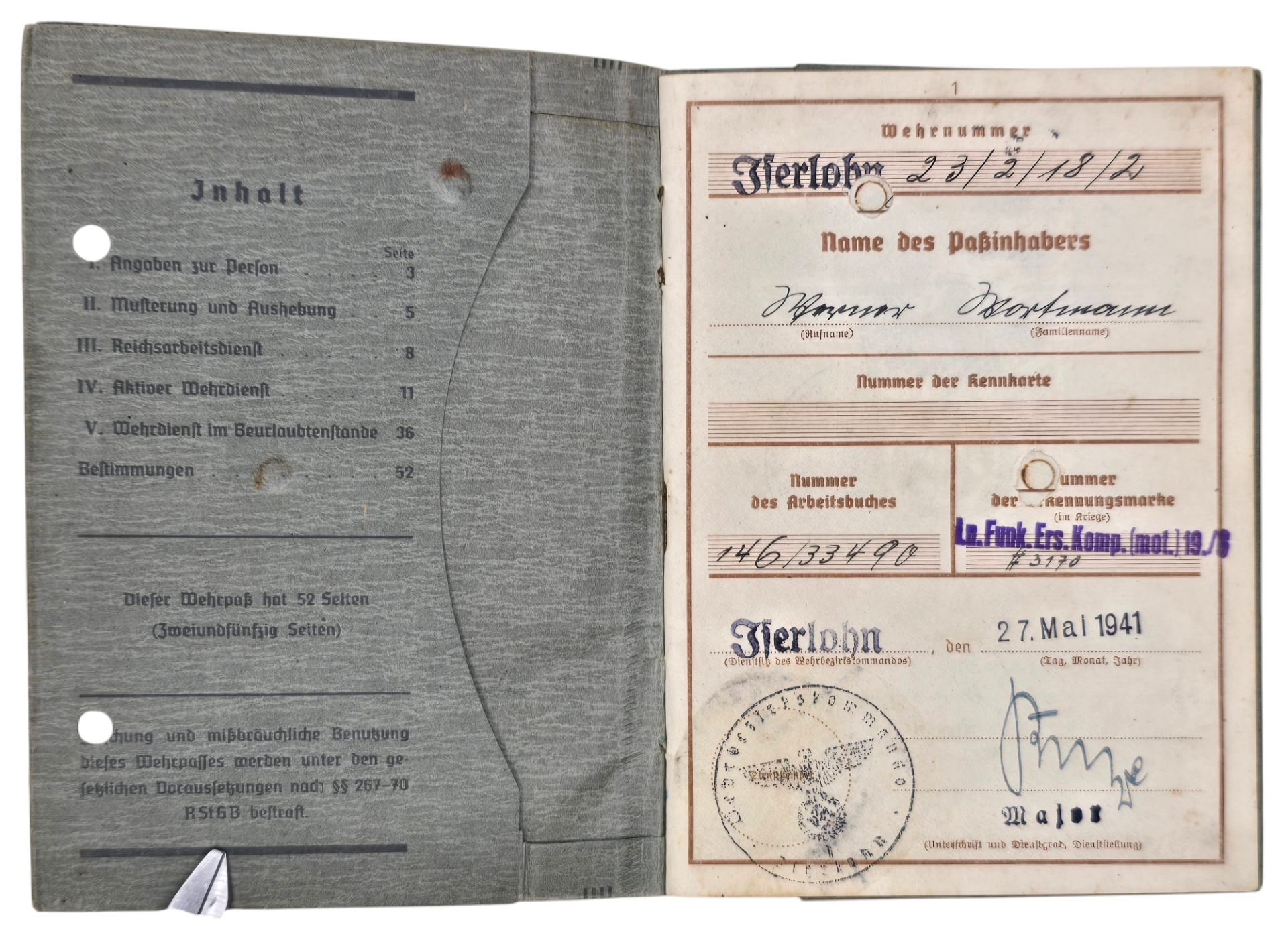 De wehrpass begint in 1942 bij de 19 Luftgau Nachrichten Regiment 6. Later verplaatste de militair zich naar het 17./ Luftgau Nachrichten Reigment Holland, in Amsterdam?. In 1944 ging hij bij de 2.Flughafen Betriebs Kompanie Kampfgeschwader 53, waar hij verantwoordelijk was voor het onderhoud aan de vliegtuigen en vliegveld. In 1945 werden de vliegtuigen van deze Kampfgeschwader geladen met V1 bommen voor Engeland. Op pagina 22 is in balpen een notitie toegevoegd, dit is vermoedelijk na de oorlog gedaan voor de volledigheid. Echter is de notitie wel correct want de betreffende promotie had de militair in de oorlog ontvangen.