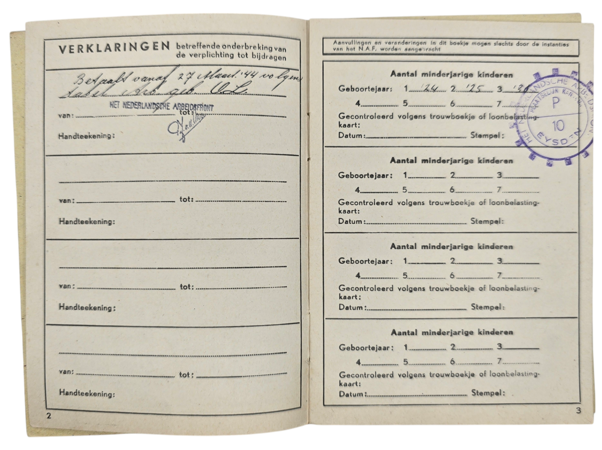 Original WW2 Dutch NAF Collaboration Document - NAF membership ID card Eysden (1944)