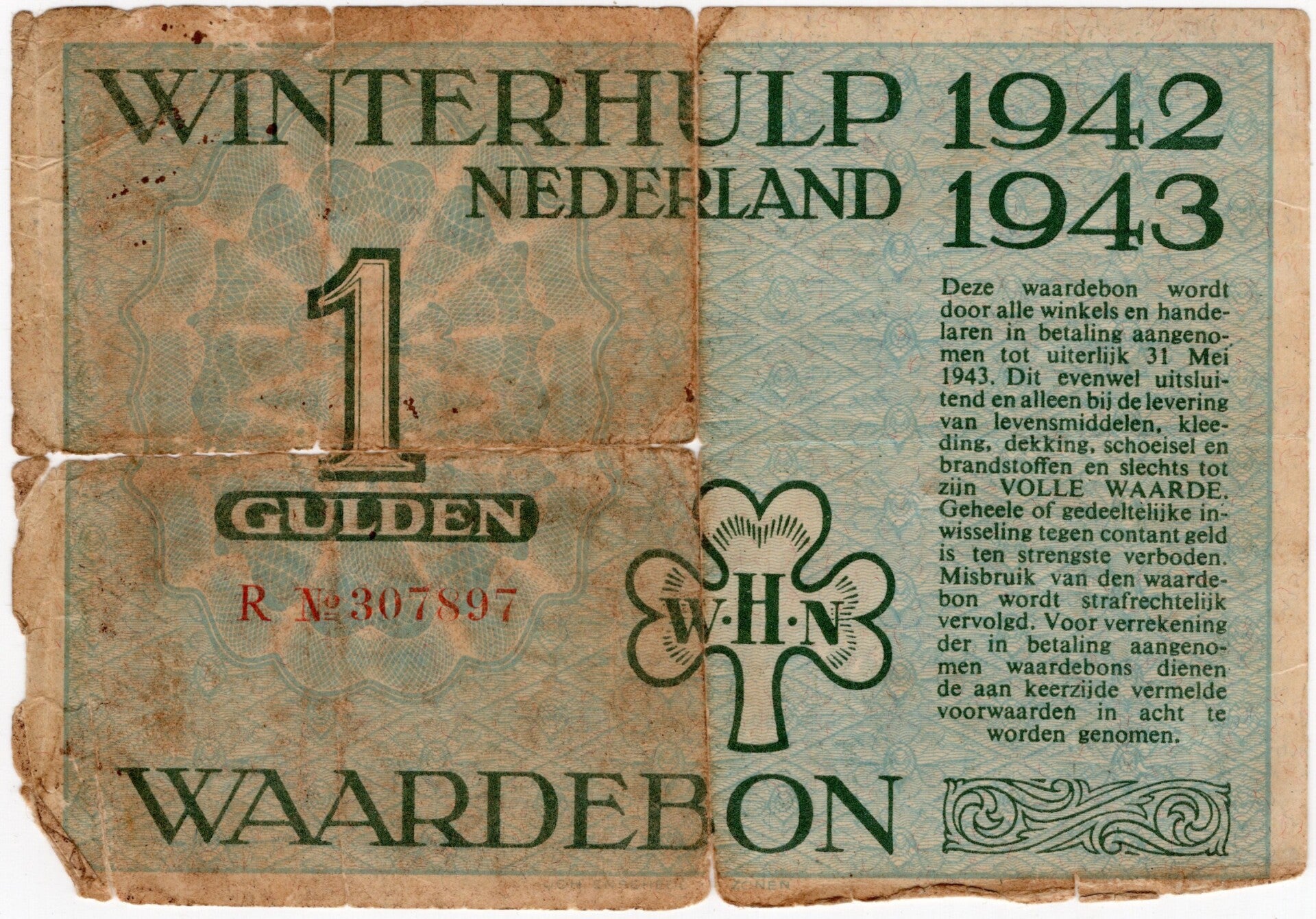Original WW2 Dutch Collaboration WHN Document - Winterhulp Nederland 1 Gulden Waardebon, Lemsterland (1942 1943)