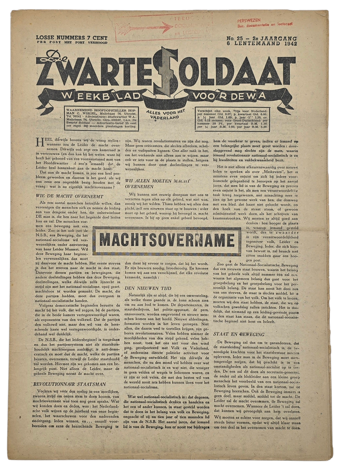 Originele WO2 Duitse Collaboratie NSB Krant - Zwarte Soldaat Weekblad voor de W.A. Tweede jaargang No. 25 (1942)