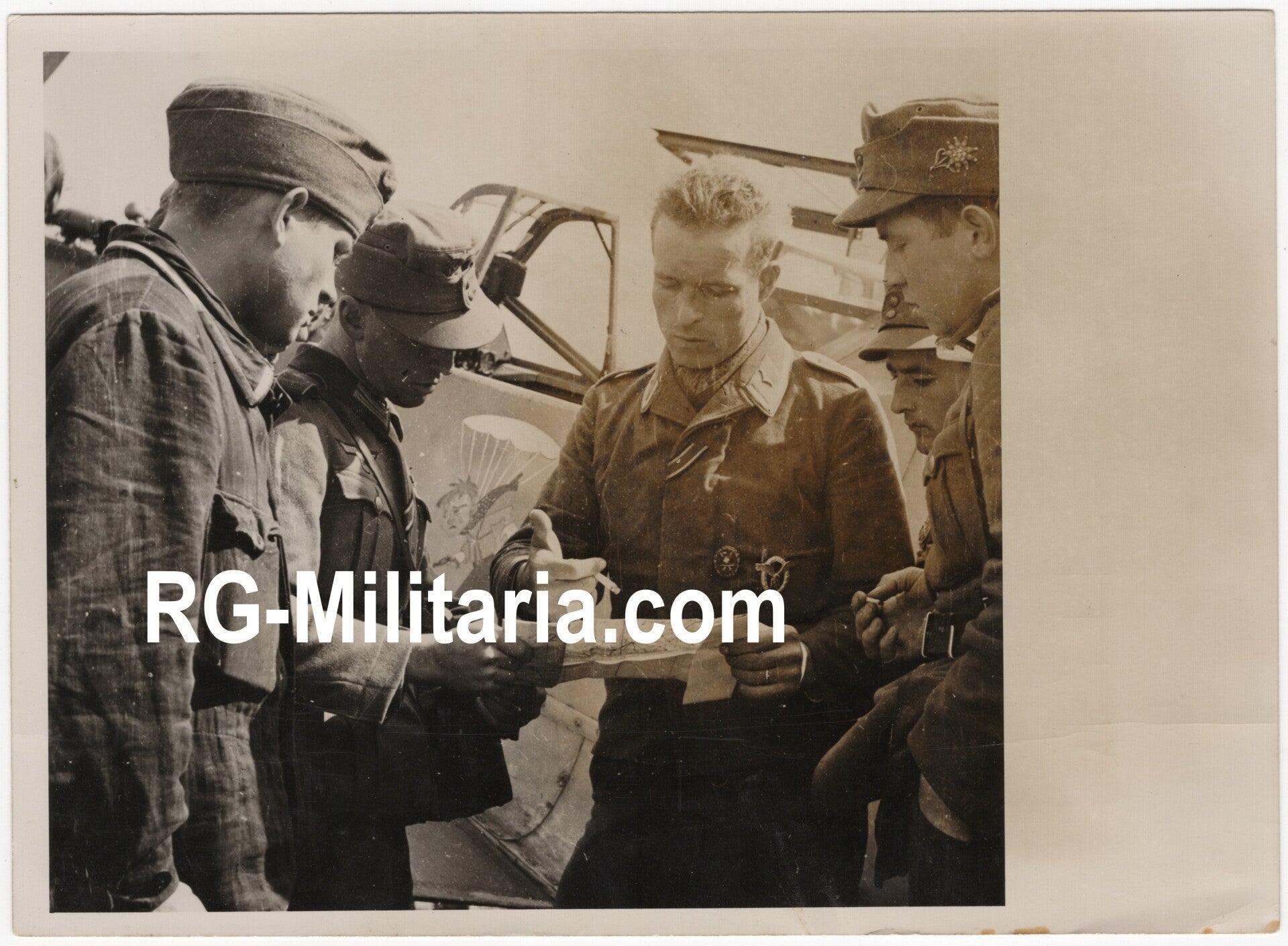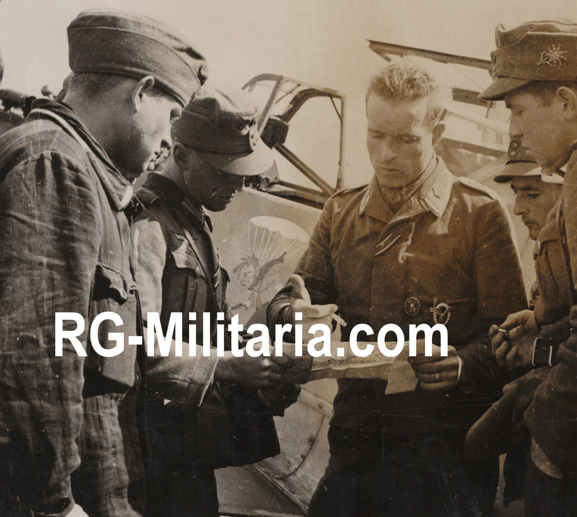 Original WW2 German Press Photo - Luftwaffe piloot discussing with Gebirgsjäger men