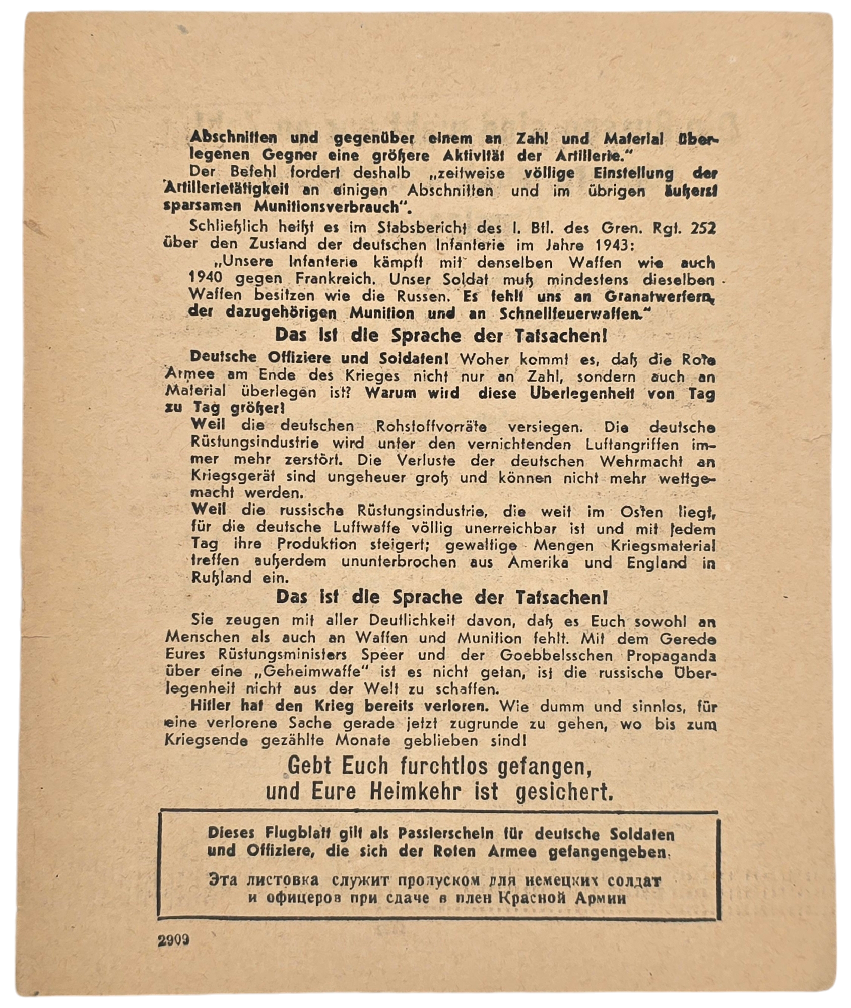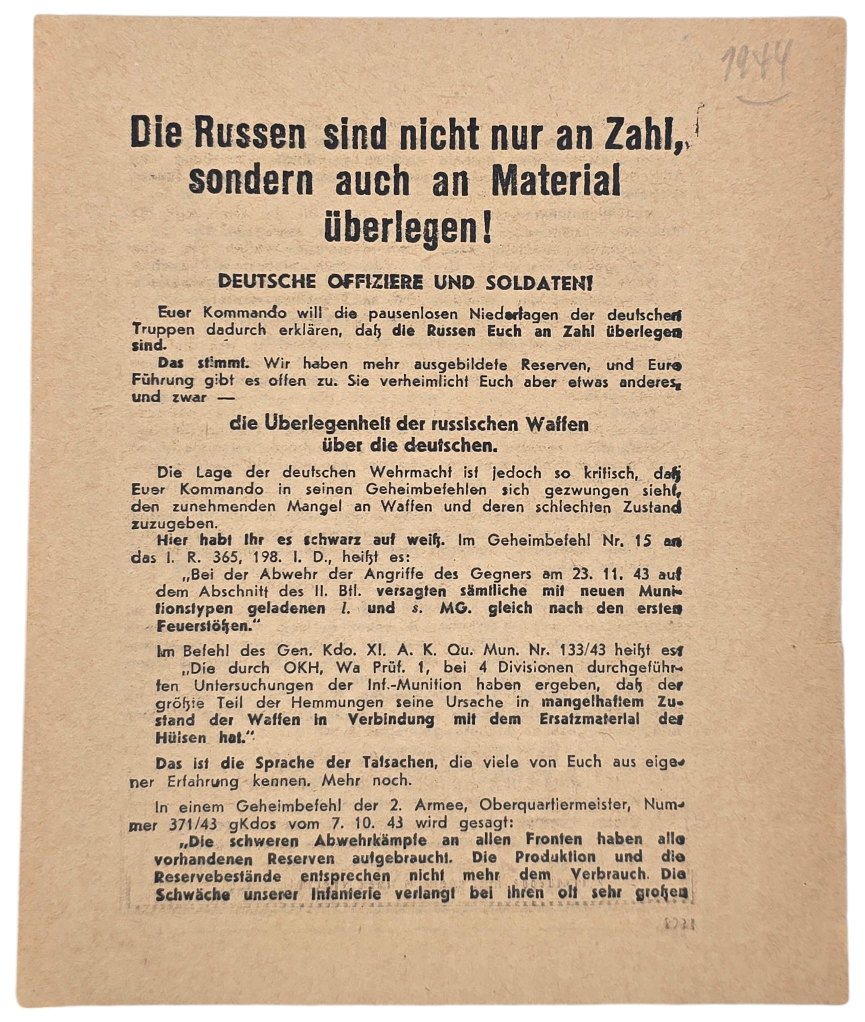 Original WW2 Russian Leaflet - 2909 "Die Russen sind nicht nur an Zahl'' (1944)