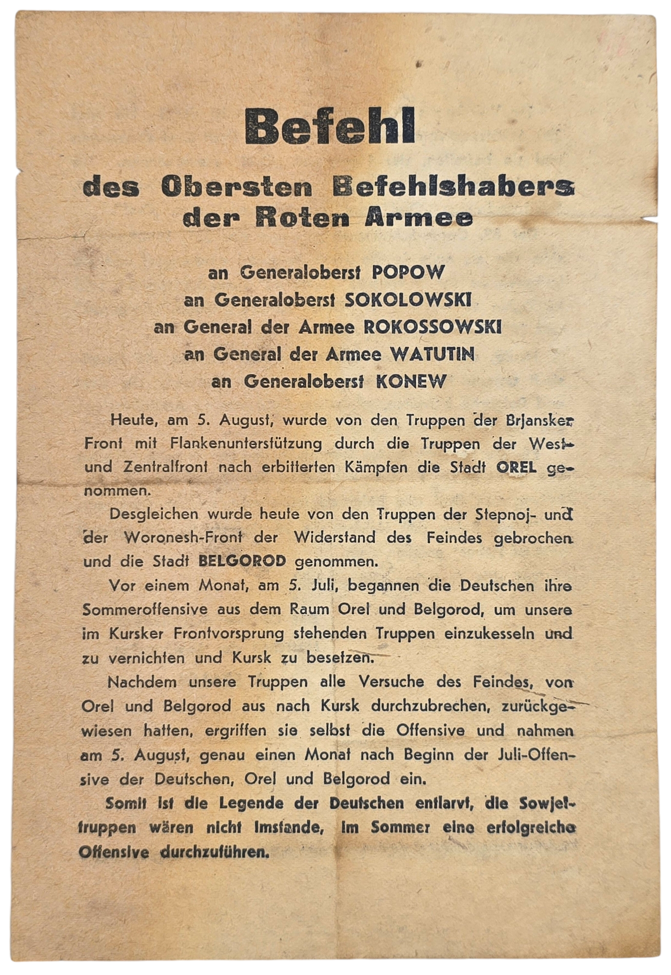 Original WW2 Russian Leaflet - 2684 "Befehl des Obersten Befehlshabers der Roten Armee, 5 August" (1943)