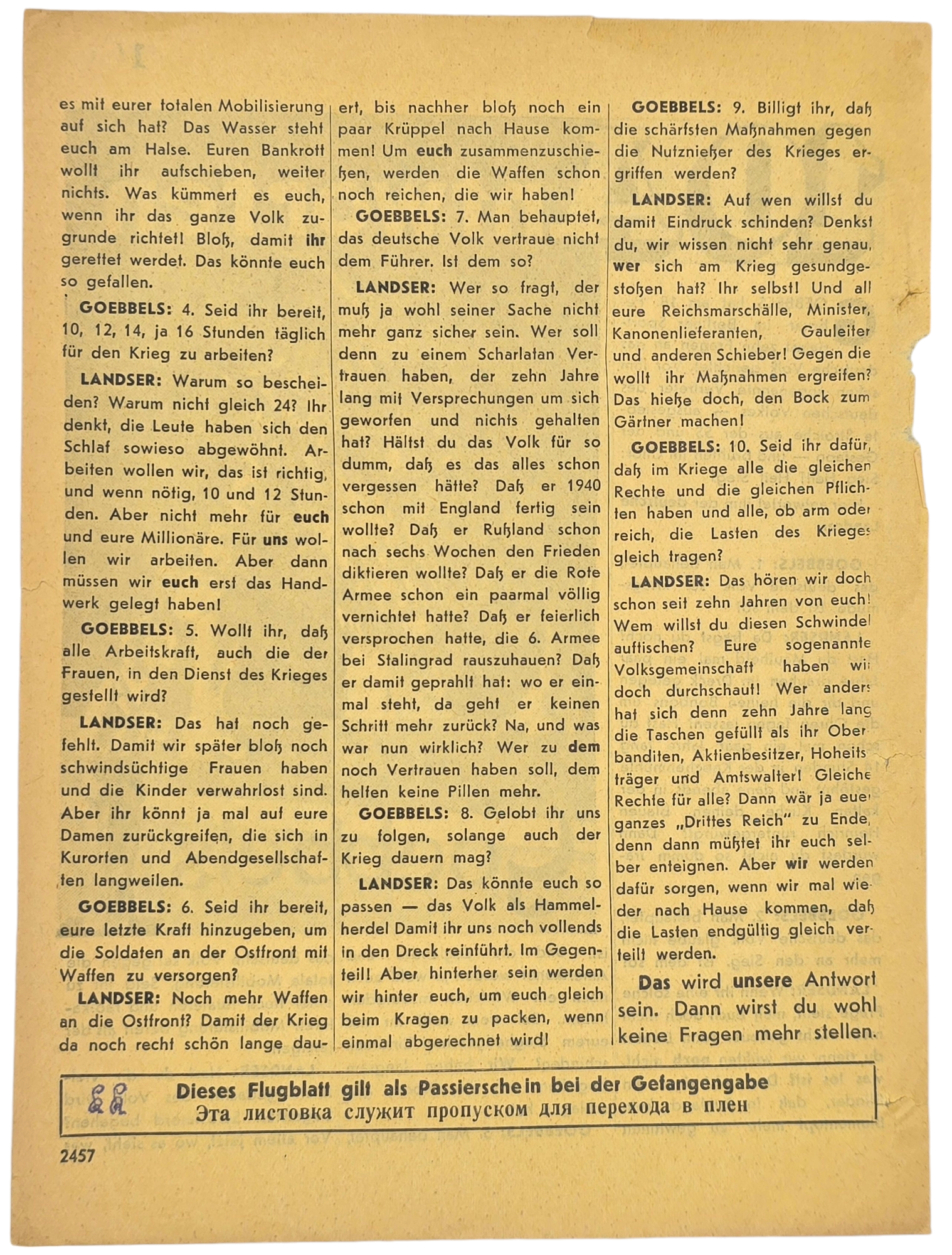 Original WW2 Russian Leaflet - 2457 "10 Antworten an Goebbels", yellow variant (1943)