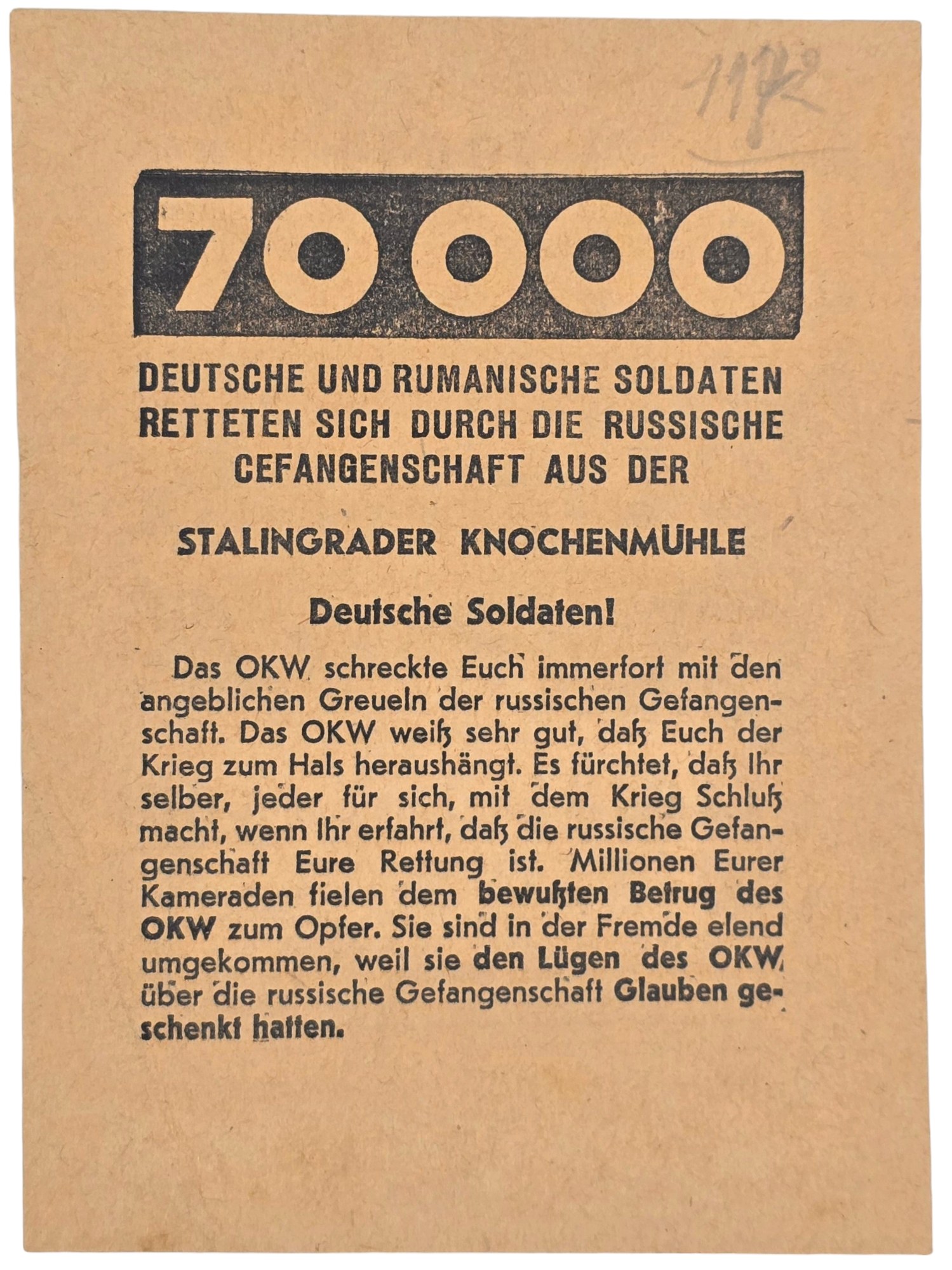 Original WW2 Russian Leaflet - 2179 "70000 Deutsche und Rumanische soldaten, Stalingrader Knochenmühle'', Stalingrad (1942)